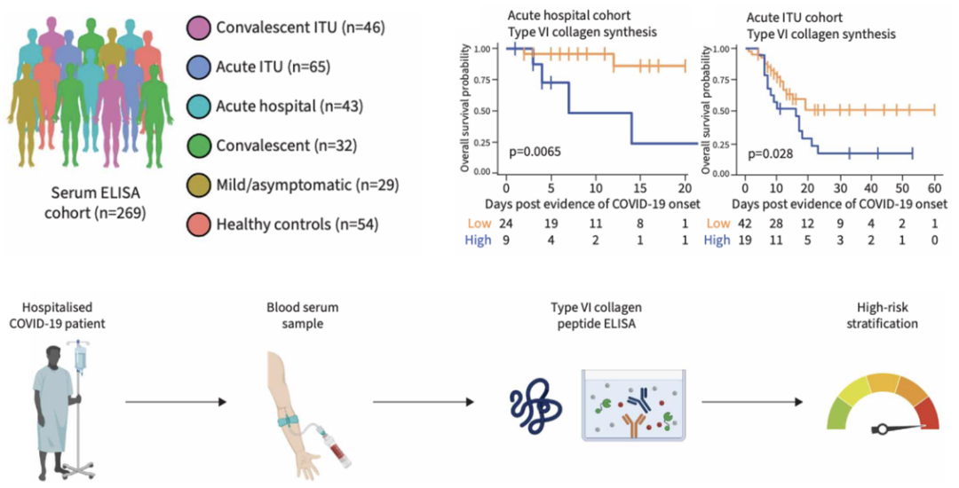 最后,研究者利用ELISA在215例COVID-19患者(轻症/无症状、急性住院、ICU、康复期)和54例健康对照的血清中检测了胶原合成/降解的相关标志物。结果发现了急性期患者中PRO-C6(胶原VI合成标志物)升高,且高水平与住院/ICU患者死亡率显著相关,可作为早期识别高危患者的潜在生物标志物。