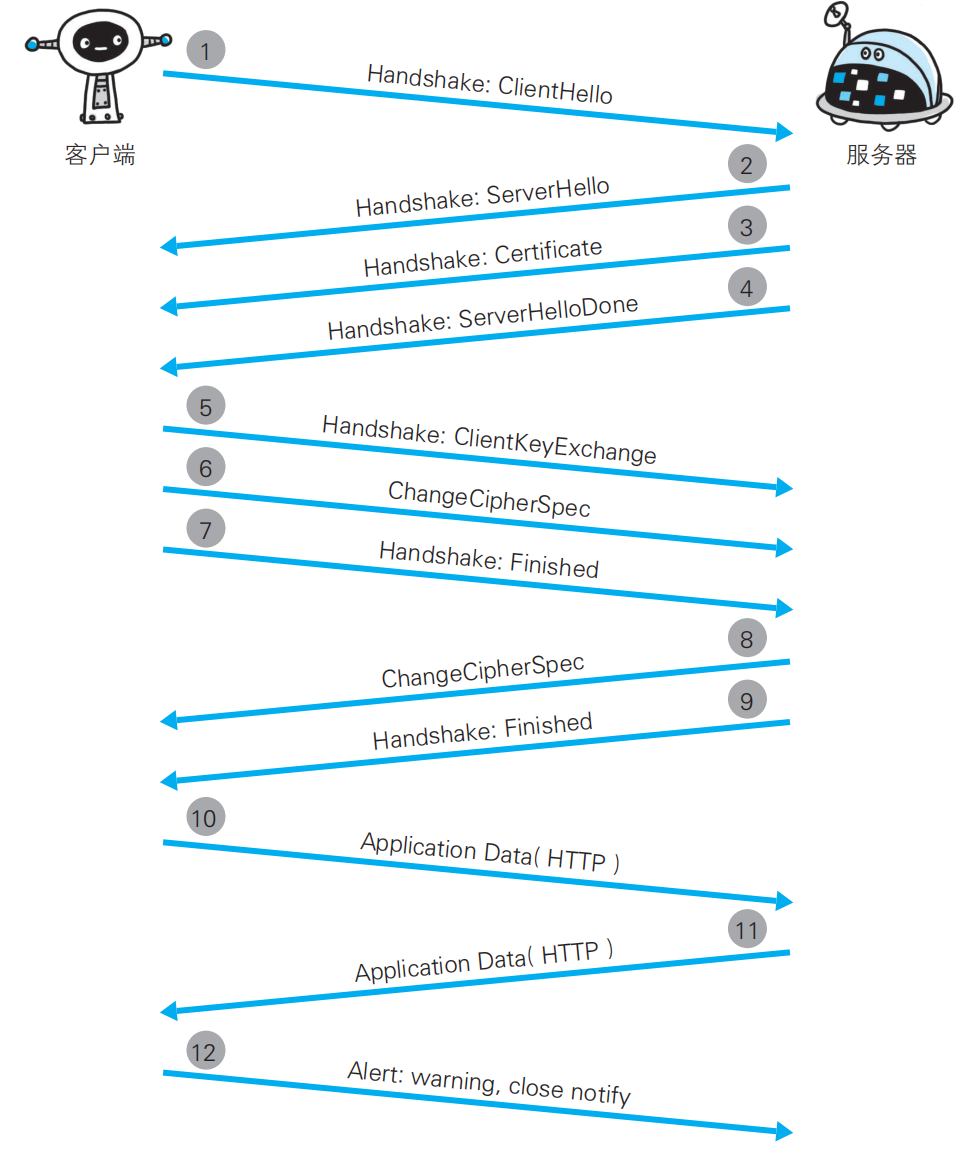 - 步骤 12: 最后由客户端断开连接。断开连接时,发送 close_notify报文。上图做了一些省略,这步之后再发送 TCP FIN 报文来关闭与 TCP的通信。