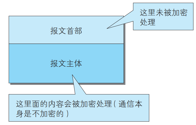 - 即使已经过加密处理的通信,也会被窥视到通信内容,这点和未加 密的通信是相同的。只是说如果通信经过加密,就有可能让人无法破解 报文信息的含义,但加密处理后的报文信息本身还是会被看到的。