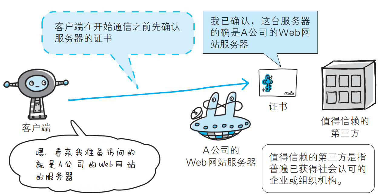 虽然使用 HTTP 协议无法确定通信方,但如果使用 SSL 则可以。SSL 不仅提供加密处理,而且还使用了一种被称为证书的手段,可用于确定方。