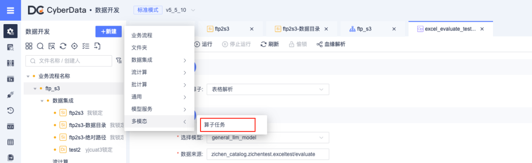 进入数据开发,点击"新建",选择多模态>算子任务并点击。可以找到相应的业务流程,右键点击批计算,选择新建节点并点击算子任务。