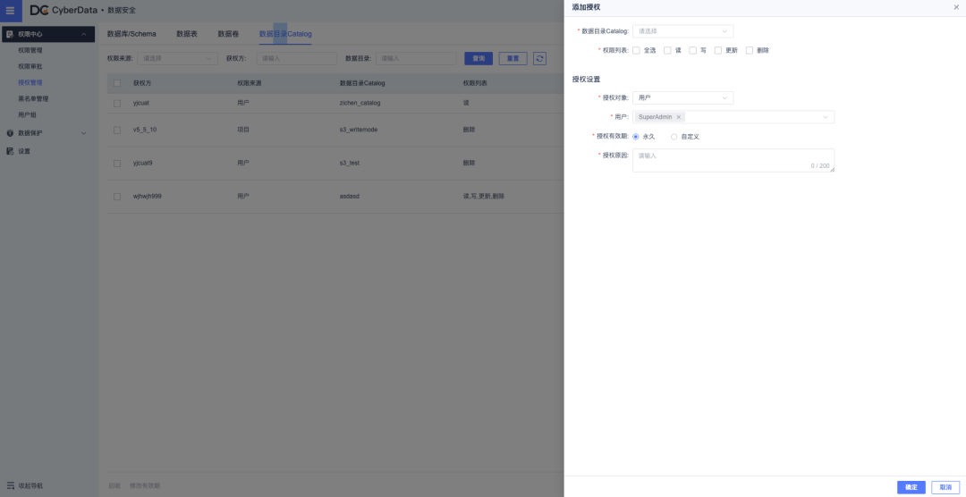 在数据目录catalog页面,点击"添加授权",在添加授权弹窗页面设置授权信息后,单击确定按钮,增加新的获权方。