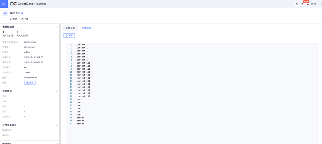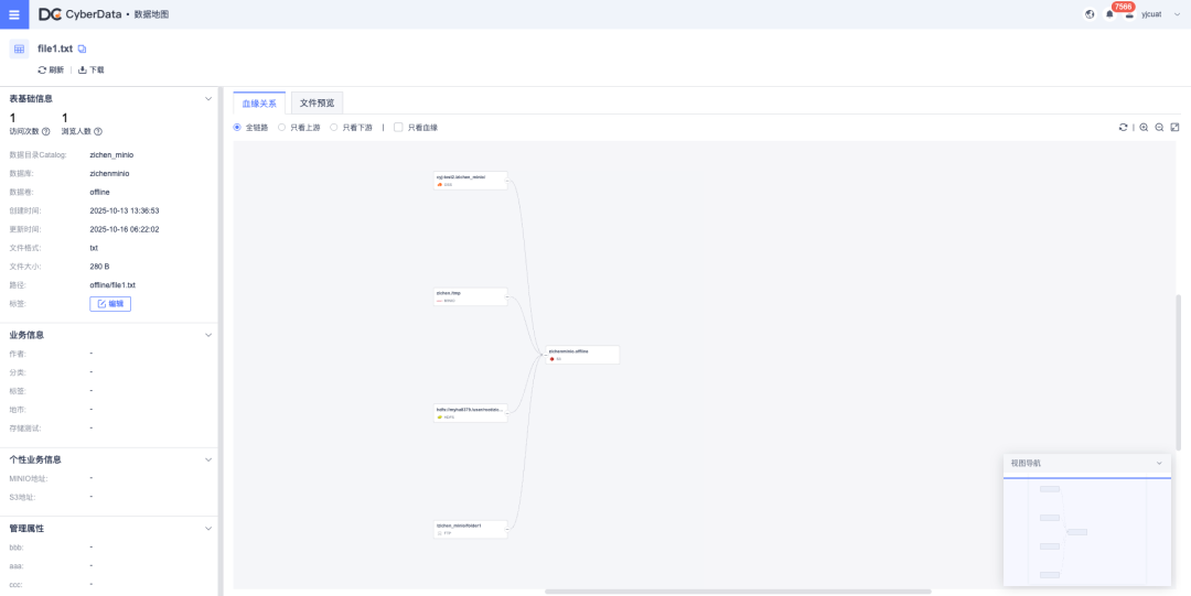 进入多模态数据详情页面,查看的基础信息、业务信息、管理属性、血缘关系、文件预览。