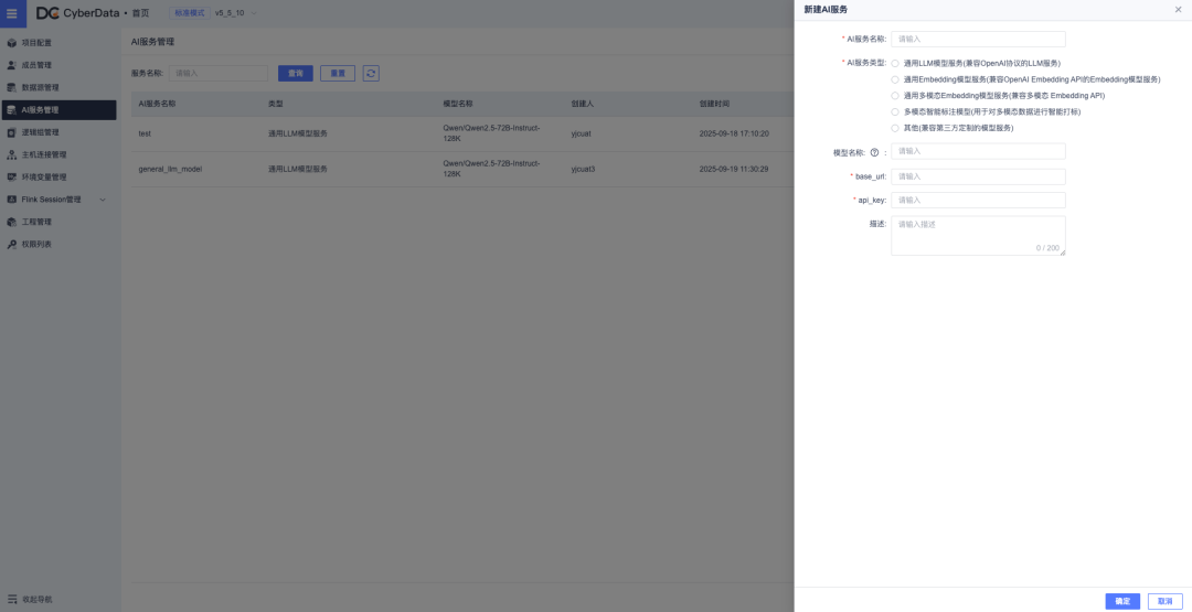 多模态数据管理功能功能直击外部模型服务管理分散的行业痛点,实现全流程集中化管控。操作流程简洁高效:进入 "AI 服务管理" 模块,点击 "新建服务",填写模型名称、访问地址、密钥等核心信息,即可完成外部模型服务接入;如需调整配置,可通过列表页 "编辑" 按钮修改参数;针对冗余服务,点击 "删除" 即可一键清理。全程支持可视化操作,无需编写复杂代码,大幅降低管理成本。