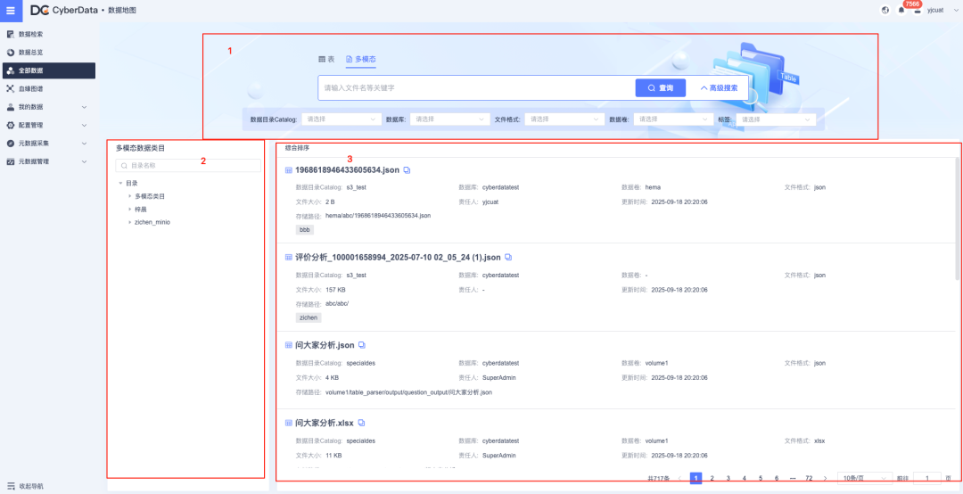 数据查找效率倍增!多模态数据检索功能支持文件名模糊查询,结合目录、Catalog、数据库等多维度过滤条件,可精准定位目标数据;类目管理功能可在 "数据地图" 模块配置类目导航,自定义分类规则后,用户查看数据时只需通过类目筛选,即可快速锁定目标文件,充分适配多样化的管理需求。此外,该平台还支持通过文件名检索多模态数据,并可依据所在目录、数据目录 Catalog、数据库、数据卷、文件格式、标签等维度完成表级过滤。