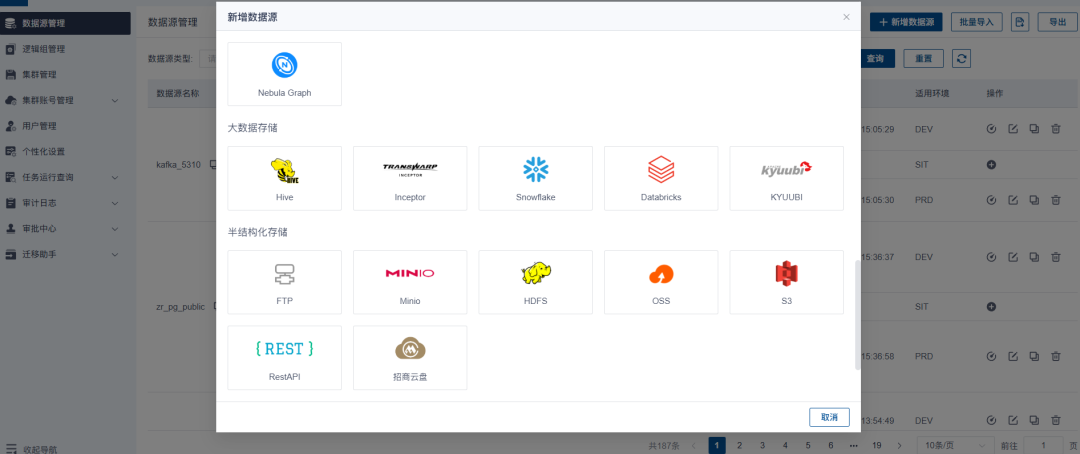 在数据源管理页面点击"新增数据源",在当前页面弹窗打开新增数据源页面,点击数据源类型,进入对应数据源类型的配置页面。