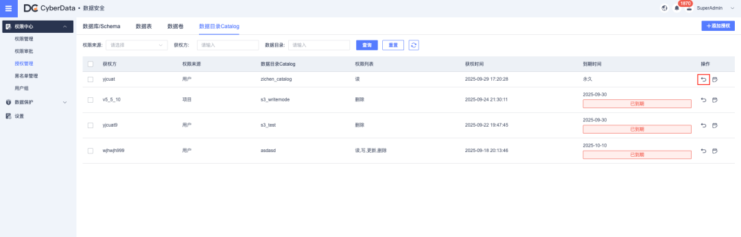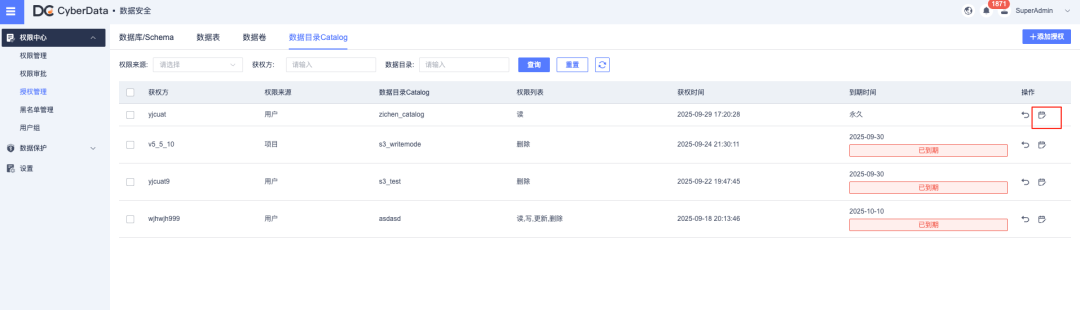 选择数据安全点击后,进入数据安全>权限中心>授权管理>数据目录catalog页面。
