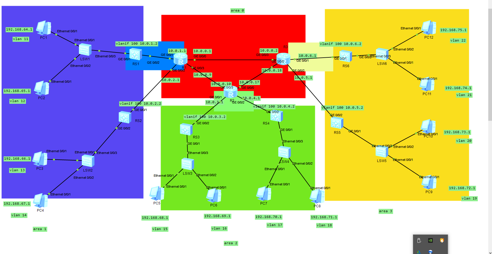 将R1、R2、R3做为边界路由进行配置,其中三台路由器构成骨干网络,pc1-pc4为area 1,pc5-pc8为area 2,pc9-pc12为area3.