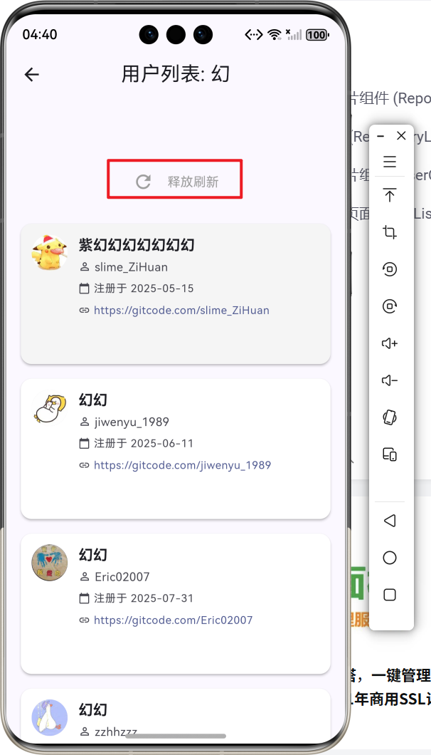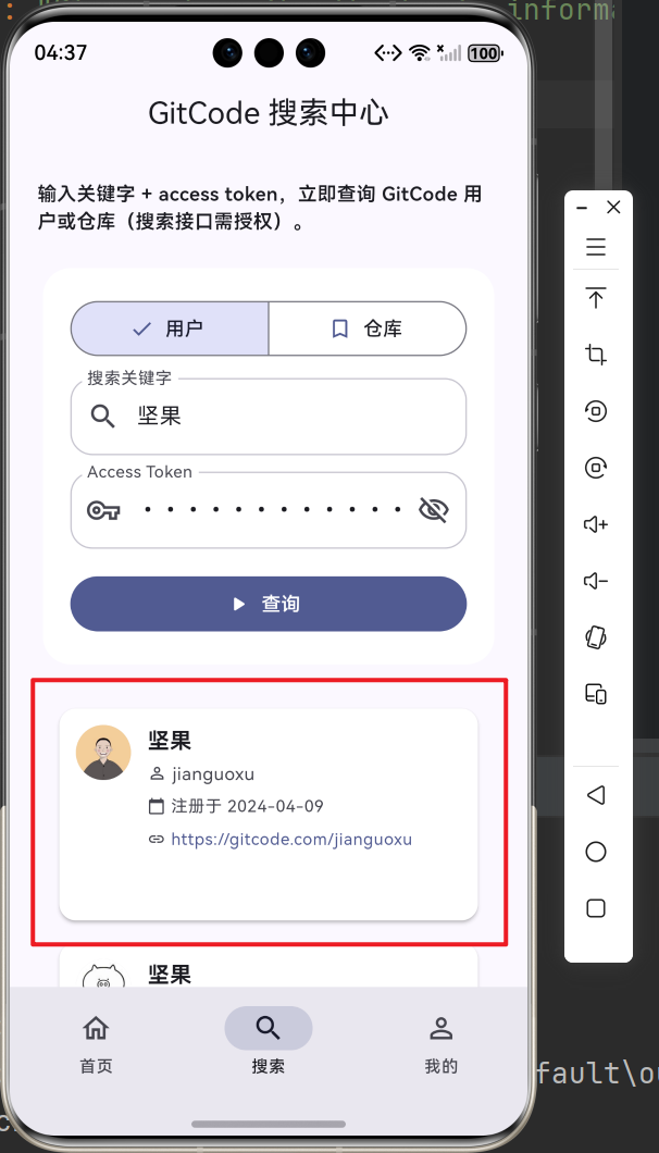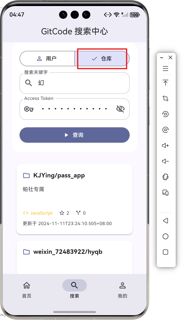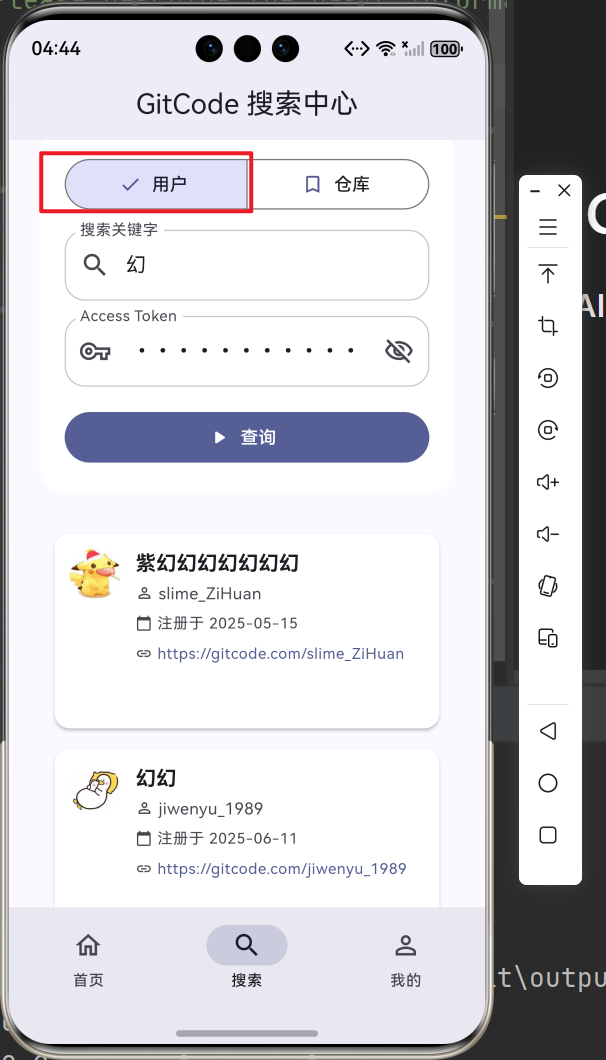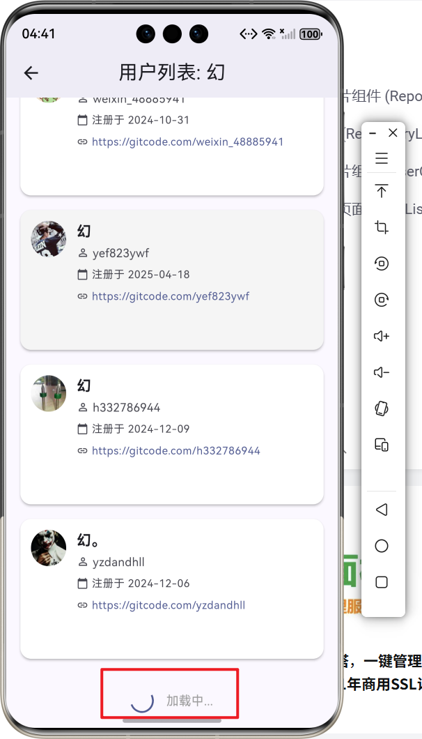 此项目基于上次的项目增加了自定义仓库列表卡片组件、自定义用户列表卡片组件、下拉刷新功能、上拉加载更多、数据分页管理。