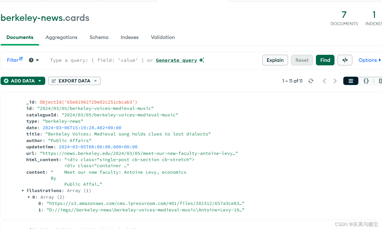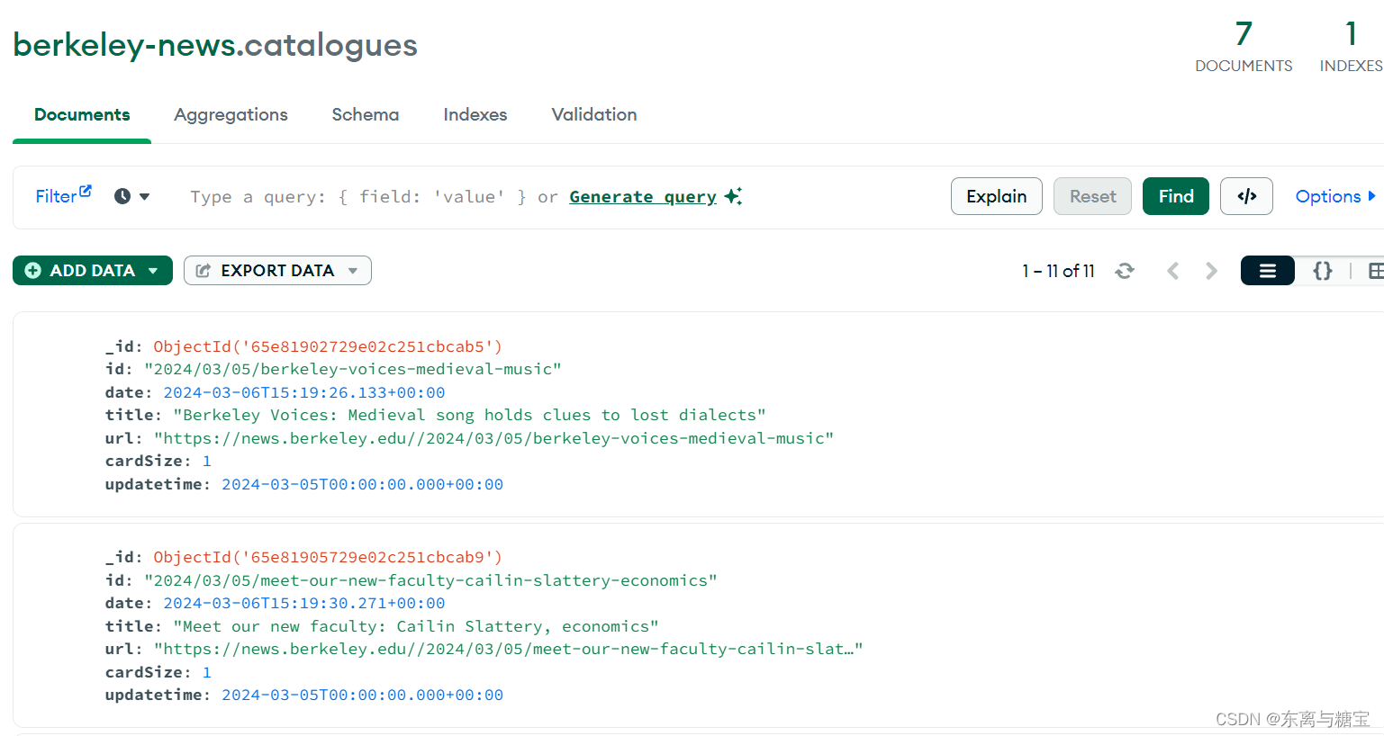 # 连接 MongoDB 数据库服务器 client = MongoClient('mongodb://localhost:27017/') # 创建或选择数据库 db = client['berkeley-news'] # 创建或选择集合 catalogues_collection = db['catalogues'] # 插入示例数据到 catalogues 集合 catalogue_data = { 'id': catalogue_id + '01', 'date': date, 'title': catalogue_title, 'url': catalogue_url, 'cardSize': 1, 'updatetime': updatetime }