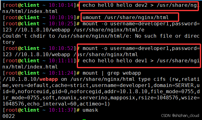 bash[root@client ~]# vim /etc/fstab # 修改挂载记录,添加multiuser //server/webapp /usr/share/nginx/html cifs samba.secrets=/etc/samba/samba.secrets,multiuser 0 0 # 卸载后,再次挂载 [root@client ~]# umount /usr/share/nginx/html;mount /usr/share/nginx/html使用mount命令挂载SMB共享。