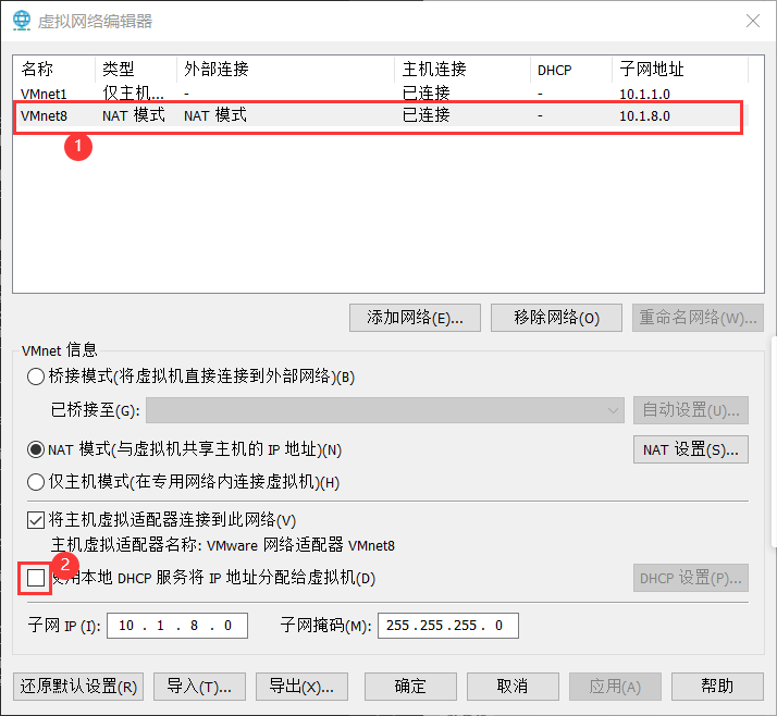 如果虚拟机连接的网络是VMnet8,则需要关闭VMnet8提供的DHCP功能。