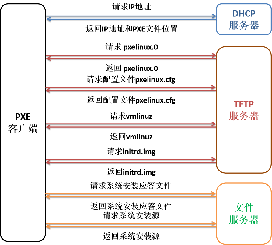 - Client启动Linux内核,加载initrd.img,读取系统启动参数,进而向文件服务器请求系统安装应答文件。文件服务器返回系统安装应答文件。