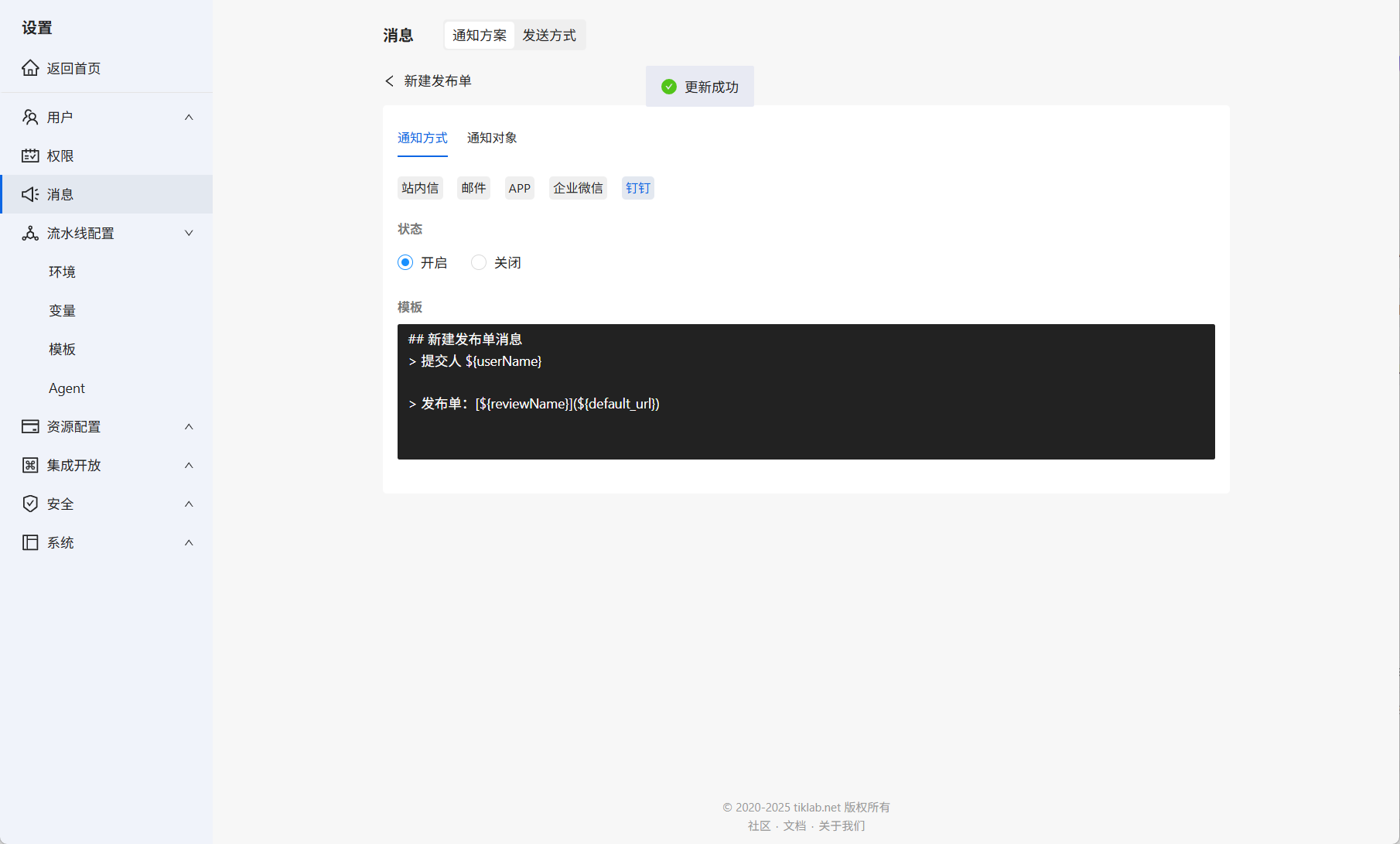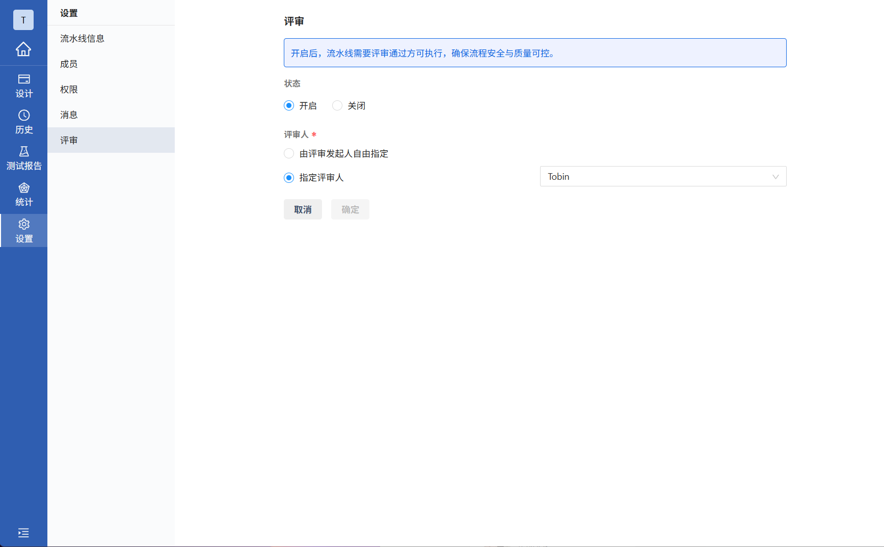 消息配置完成后,还需要开启流水线发布审核,进入流水线详情,在流水线设置的评审,开启当前流水线评审并配置评审人。