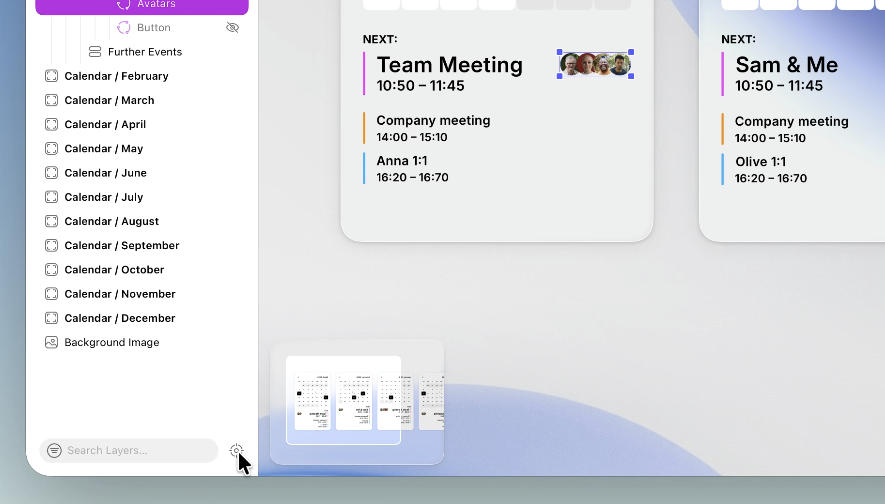 图层列表新增"聚焦模式"默认开启,仅显示当前选中图层、其父容器及同级兄弟元素,避免复杂文件干扰。若选中画布顶层对象,则自动恢复完整列表。用户可通过侧边栏底部按钮或命令栏快速切换。图层间新增路径连线展示嵌套关系,按住Option键点击前进箭头可跳转至画布位置。