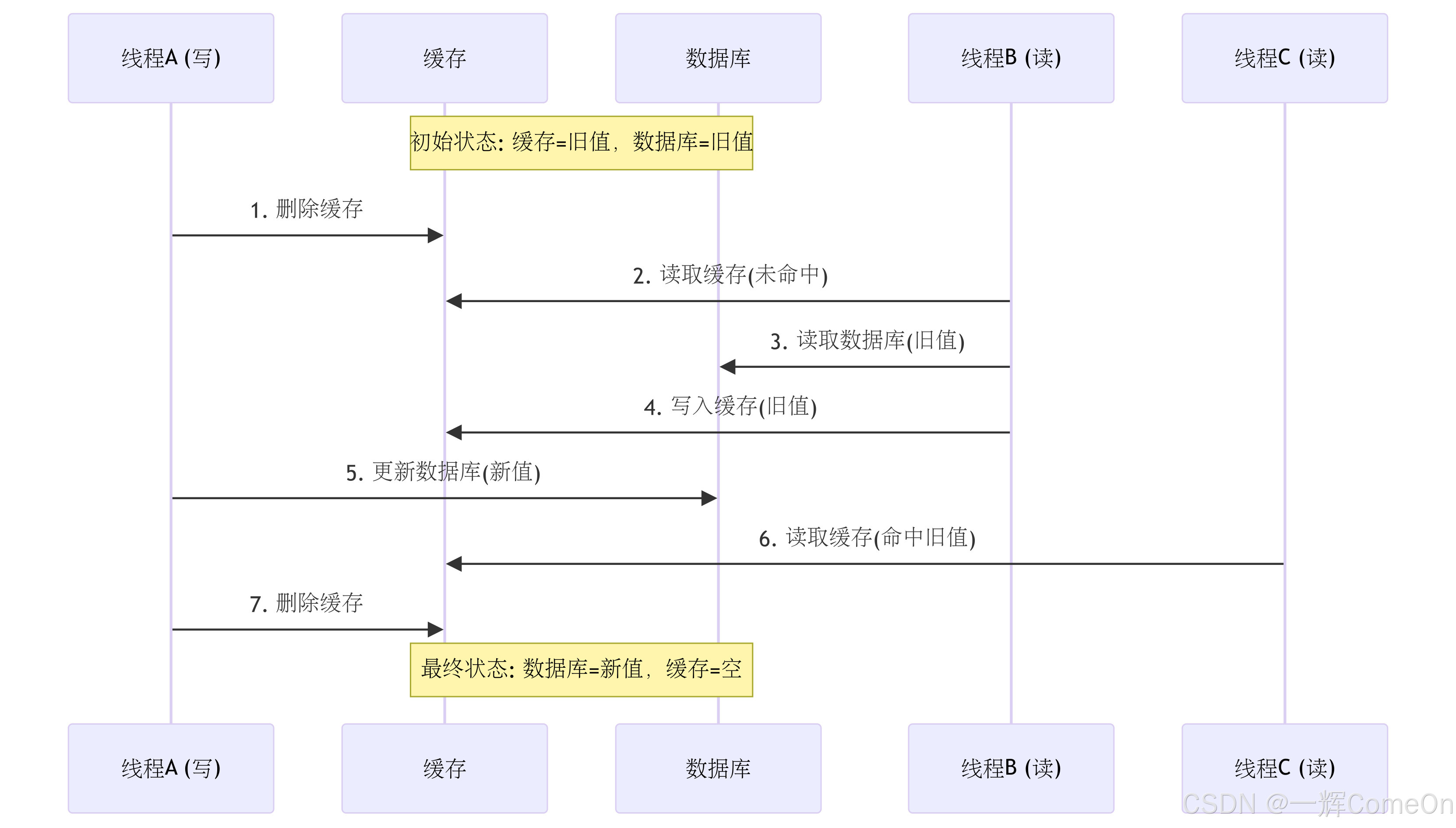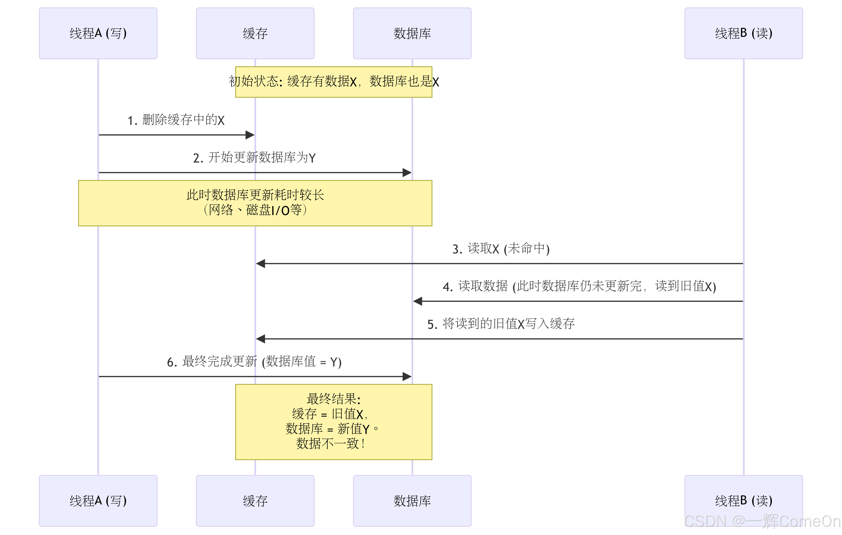 - **结果**:数据库最新值为 `b`,缓存却为 `a`,再次不一致。