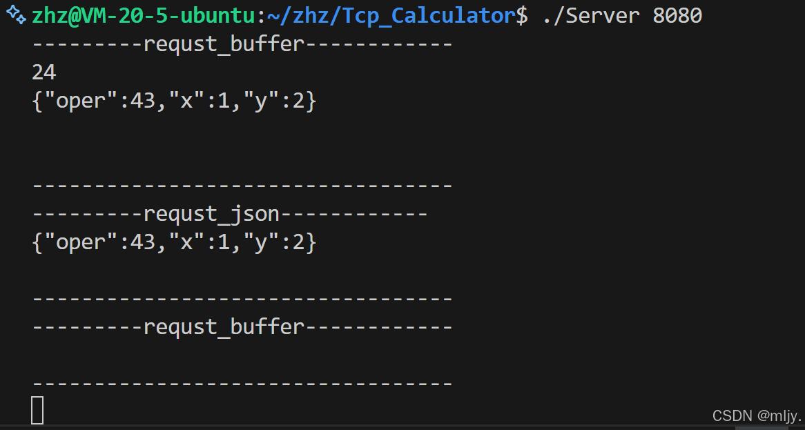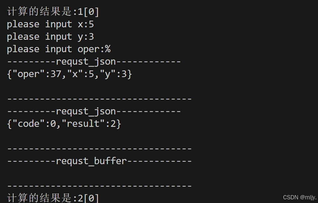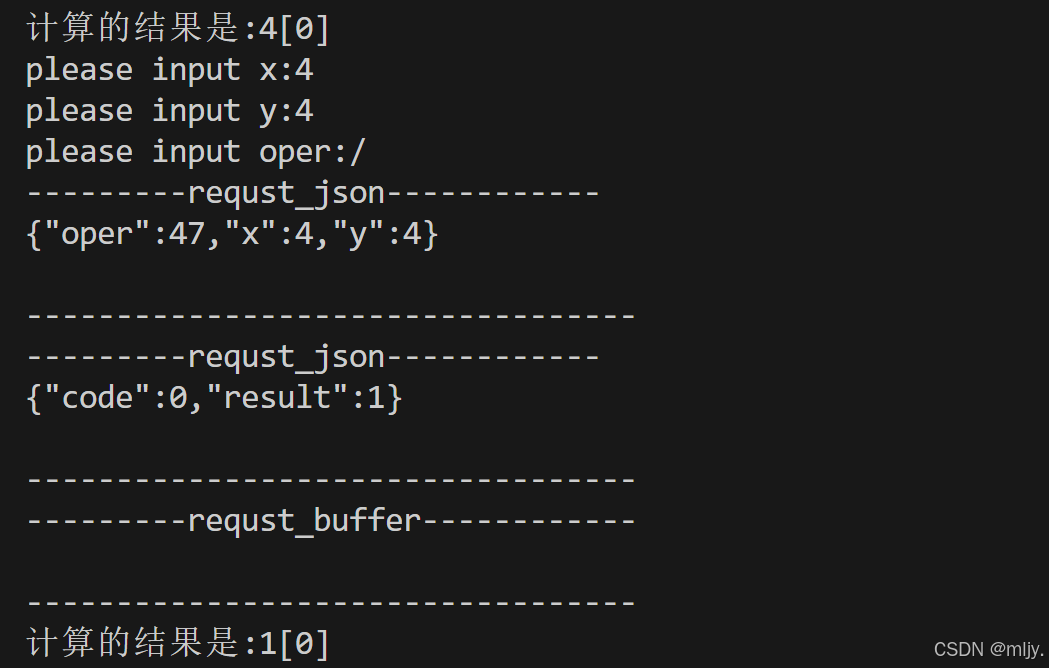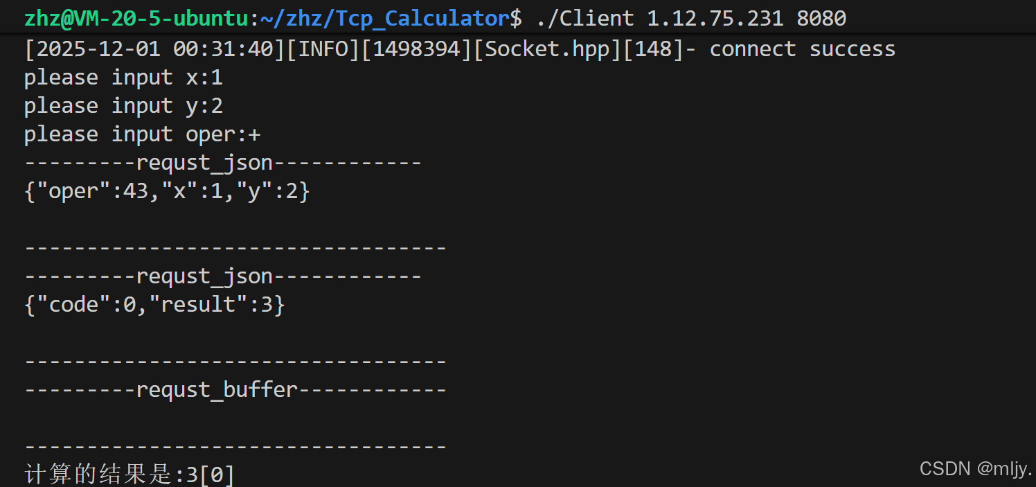 以上就实现了Client.cc的代码,实现的原理就是通过创建出Socket的对象之后通过调用对象的内的函数来实现套接字创建以及服务器连接的工作。接下来再创建Protocol对象,接下来通过该对象当中的BuildRequeString函数来实现序列化字符串的构建,之后再向服务器当中发送数据,最后通过Getsponse函数来得到服务器计算之后的结果。最后将得到的结果显示再客户端上。