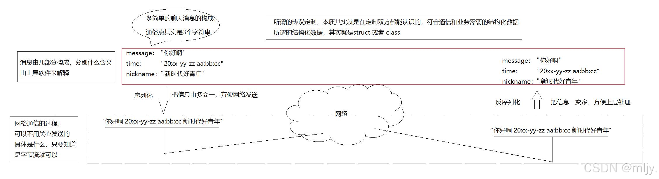 但实际上更适合的是在在发送的主机和接收的主机当中都定义一个结构体来进行数据的接收和发送,在此序列化就是将对应的信息填入到结构体当中,反序列化就是将结构体当中的信息读取出来。