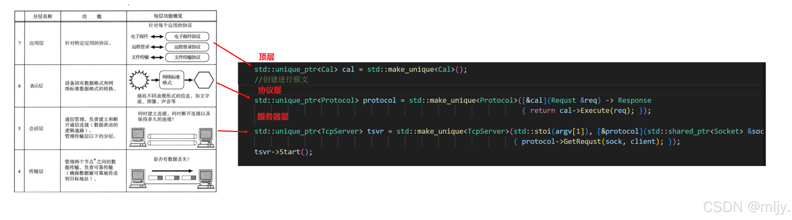 在之前学习网络当中的协议栈的时候我们就了解到OSI模型是分为7层的,相比原来的5层模型当中将应用层再具体的划分为会话层、表示层和应用层。但是在之前的学习中还是无法理解为什么要将应用层具体的划分为三层,但是通过以上编写的网络网络版本计算器就可以看出实现我们在编写的过程当中就是将项目中的应用层划分为具体的三层。