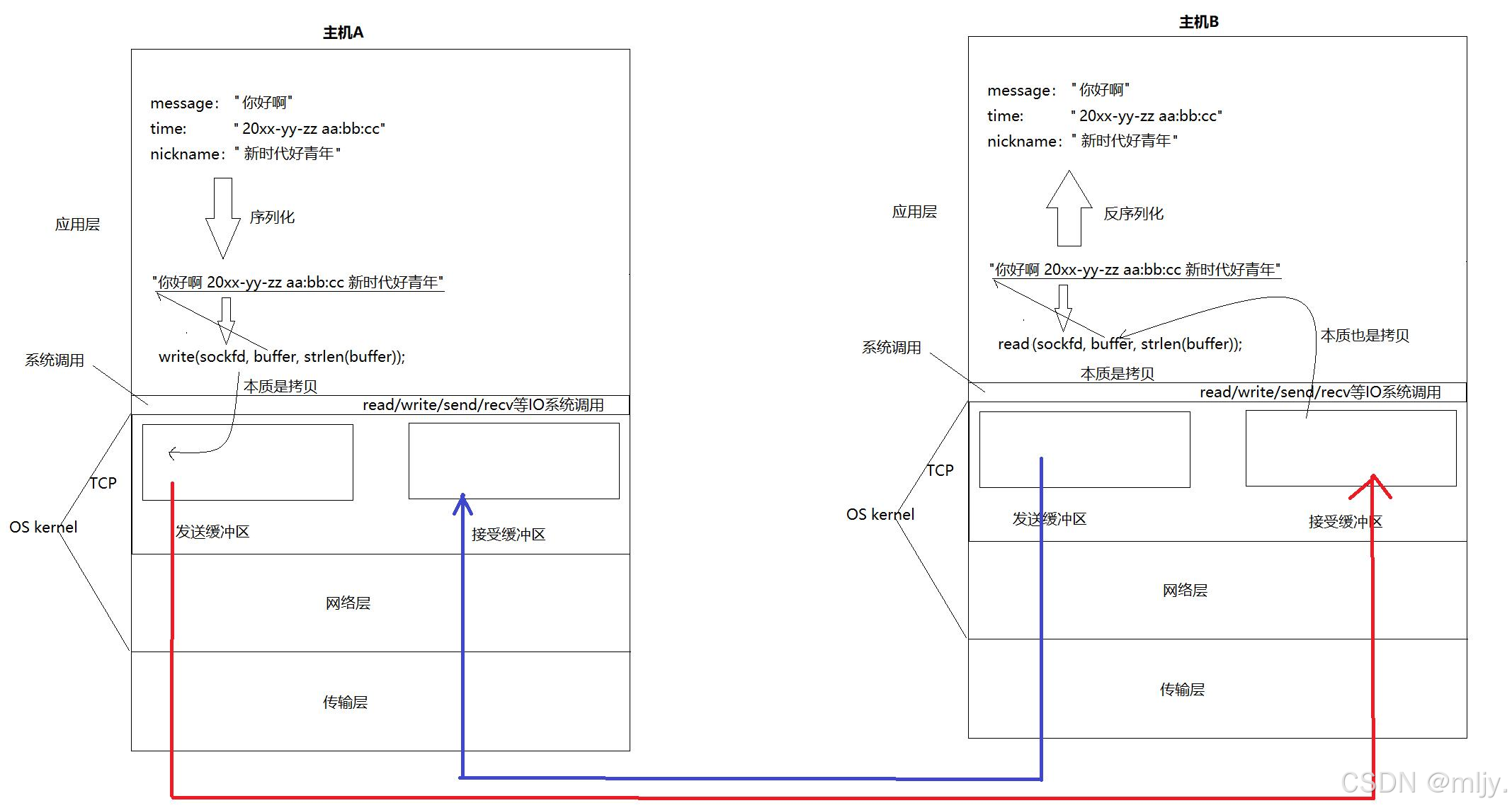 通过以上的图就可以看出在对应的协议栈当中在TCP层当中一个主机当中是存在对应的发送缓冲区和接收缓冲区的,这时主机当中的数据就能实现接收和发送互不影响。这也是一个sockfd就能实现对应的接收和发送的原因。并且我们还要知道的是在我们使用write和read等的系统调用的时候实际上并不是真正的将对应的数据直接发送到网络当中,而是从对应的缓冲区当中接收或者发送数据,这也就更能验证之前我们在进程间通信当中了解到了计算机当中的一切数据传输本质上就是拷贝。