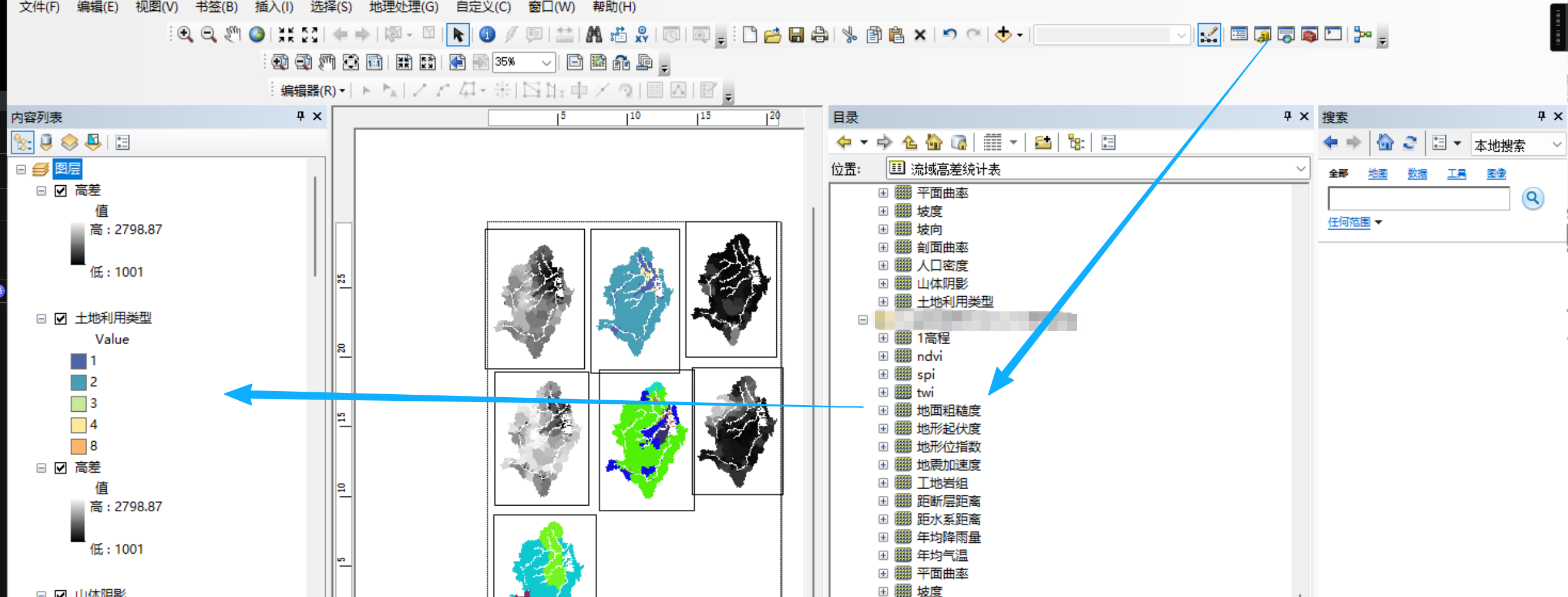 从工具箱旁边的目录文件点击进去,文件夹有过连接,展开对应的栅格数据文件夹,可以直接拖进去