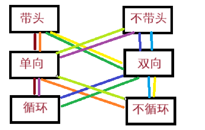 带头链表与不带头链表、单向链表和双向链表、循环链表和不循环链表。 -