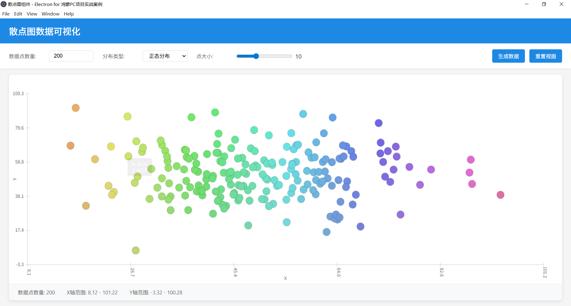 本项目实现了一个基于Electron的散点图数据可视化应用,用于展示二维数据点的分布和关系。应用采用纯JavaScript实现,通过Canvas API直接绘制散点图,支持多种数据分布类型(正态分布、均匀分布、随机分布),提供交互式操作(拖拽平移、滚轮缩放、鼠标悬停数据提示),以及点大小调整等功能。应用架构遵循Electron的主进程-渲染进程模式,使用contextBridge安全暴露API,确保良好的性能和用户体验。