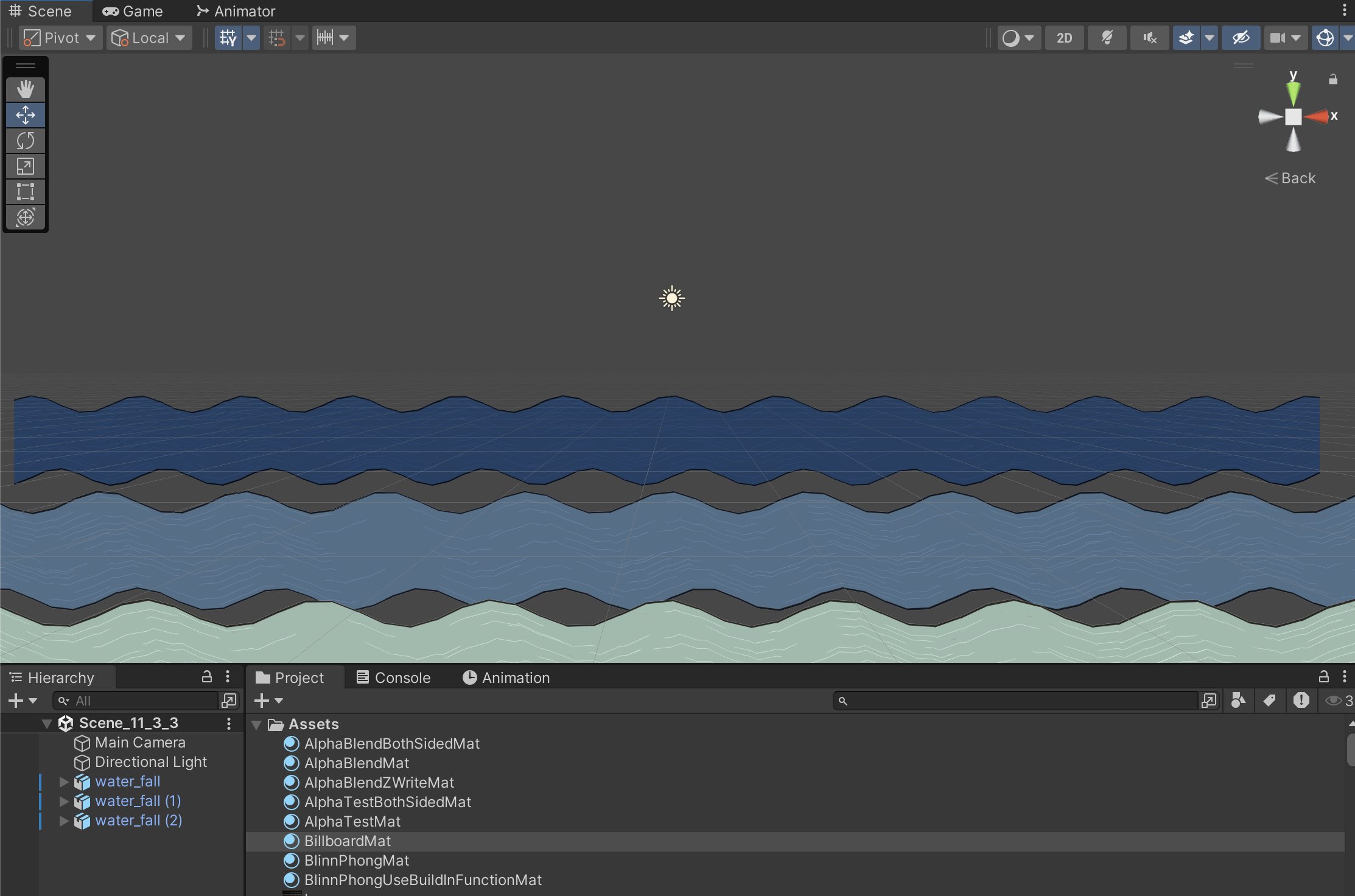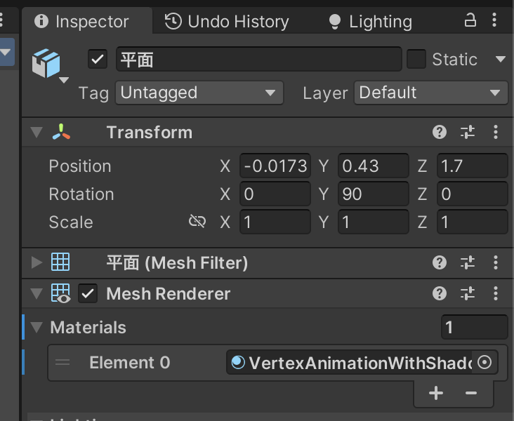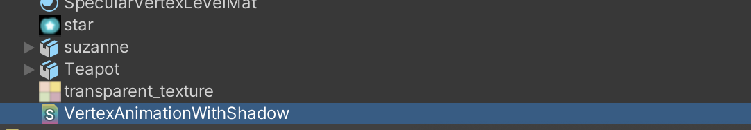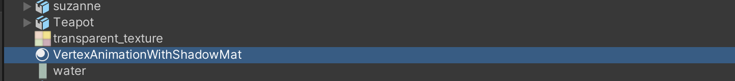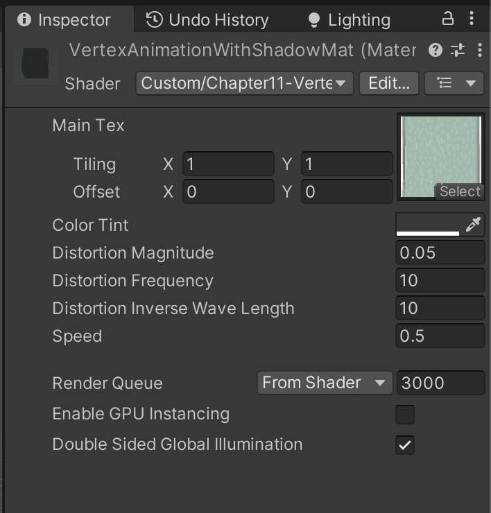 创建 VertexAnimationWithShadow.mat,把 Chapter11-VertexAnimationWithShadow赋给 mat,main tex 用和 WaterMat.mat 一样的