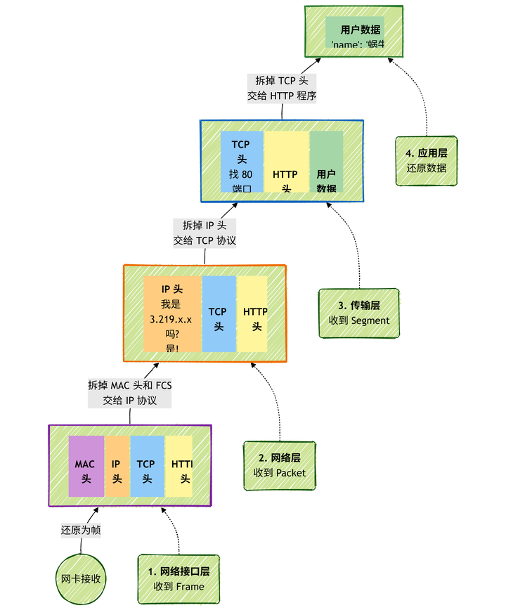 接收数据,就是从第1层到第7层,一层层拆箱子的过程。