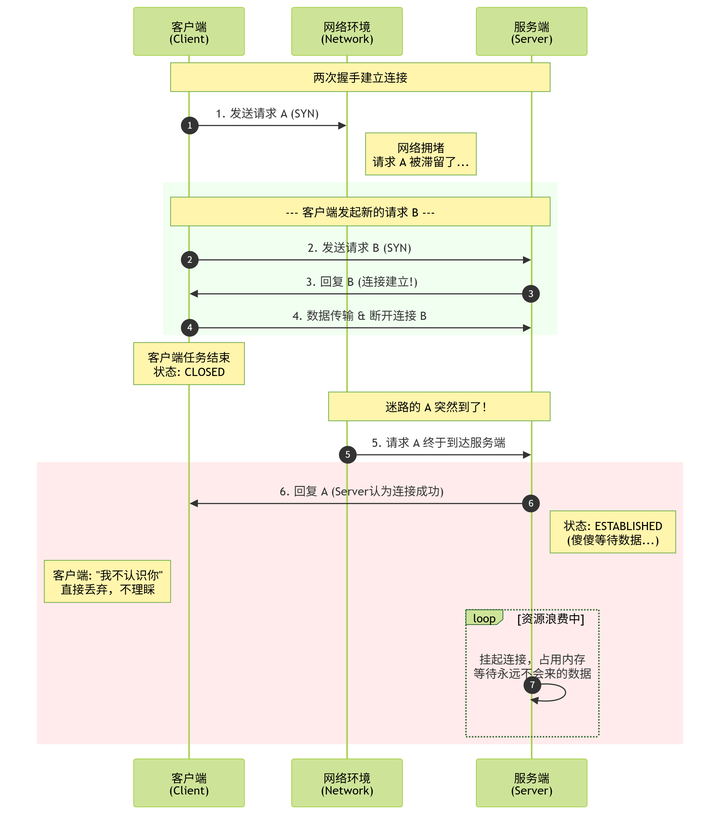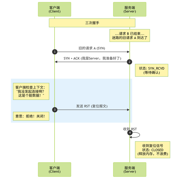 这种情况如果有了第三次握手,服务端回复A的时候,客户端会发现:"我没想连啊?",然后发个RST(复位)包拒绝掉,就不会浪费资源了。