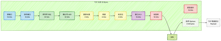 接着是16位的窗口大小,这是接收方的缓冲区剩余大小。这是一个自我保护机制。接收方会告诉发送方:我仓库还剩1000字节的空位,你最多只能发这么多。