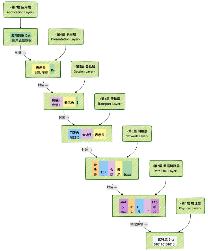 发送数据,就是从第7层到第1层,一层层套箱子的过程。