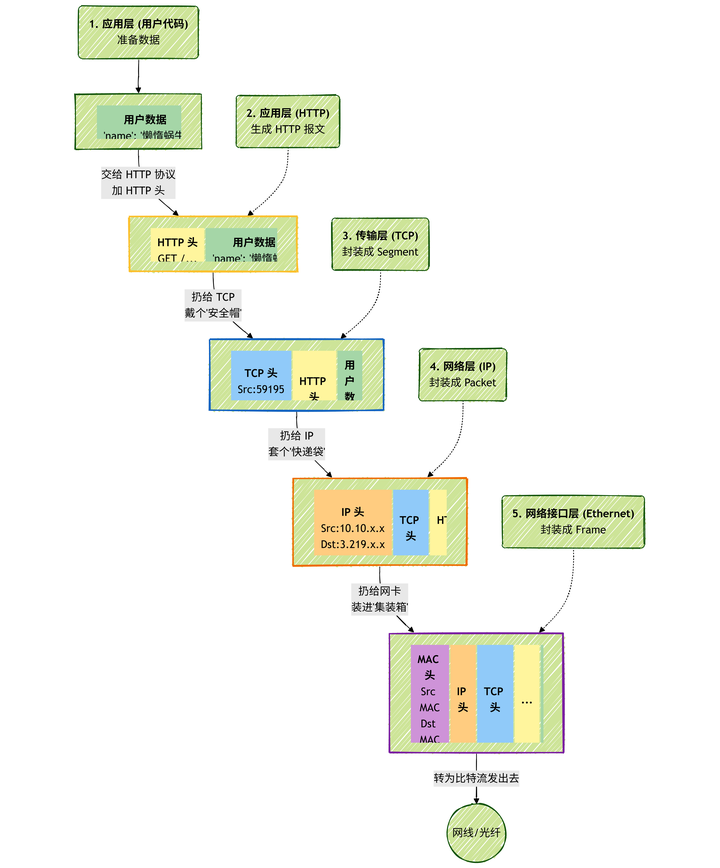 今天我们换个角度。大家都是写代码的,我们把OSI模型看成是一个数据打包的过程。