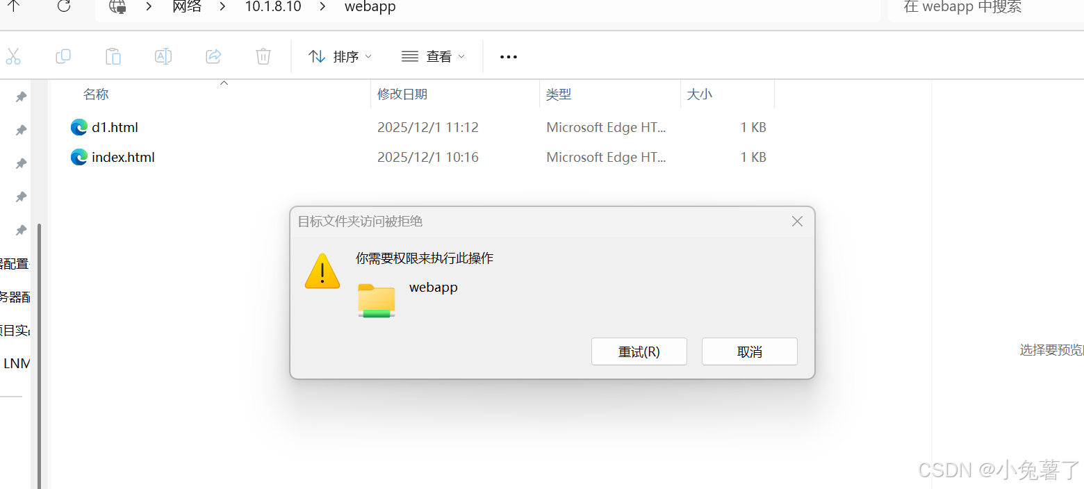 bash#切换到operator1用户 [root@client ~ 11:32:04]# su - operator1 #尝试列出Samba挂载目录(/usr/share/nginx/html),这里的Permission denied不是 "文件系统权限"(如chmod设置),而是 "未通过 Samba 身份验证" 导致的访问拒绝。 [operator1@client ~ 11:32:13]$ ls /usr/share/nginx/html ls: cannot access /usr/share/nginx/html: Permission denied # 运行cifscreds命令配置凭据。 [operator1@client ~ 11:32:37]$ cifscreds add 10.1.8.10 Password: `123` #成功看到文件。 [operator1@client ~ 11:33:02]$ ls /usr/share/nginx/html d1.html index.htmlcifscreds 命令将子命令作为其第一个参数,并将Samba服务器名称作为第二个参数。