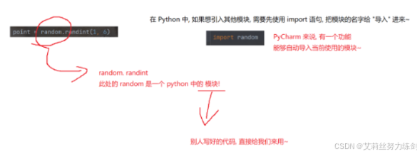 # random.randint-->此处的random是一个Python中的模块(比如==别人写好的代码,我们直接来用)!
