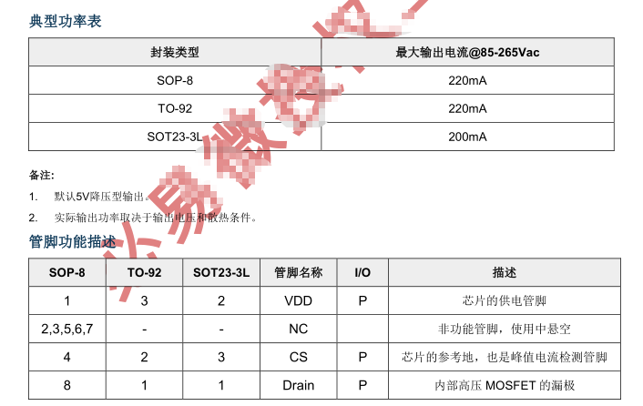 | KP3111SPA | 标准贴片(SOP-8),部分引脚悬空 | Pin1: VDD Pin4: CS Pin8: Drain 其余:NC(悬空) |