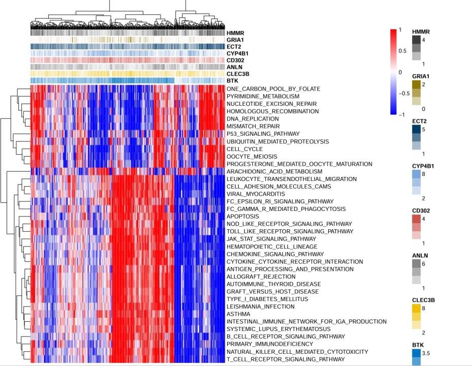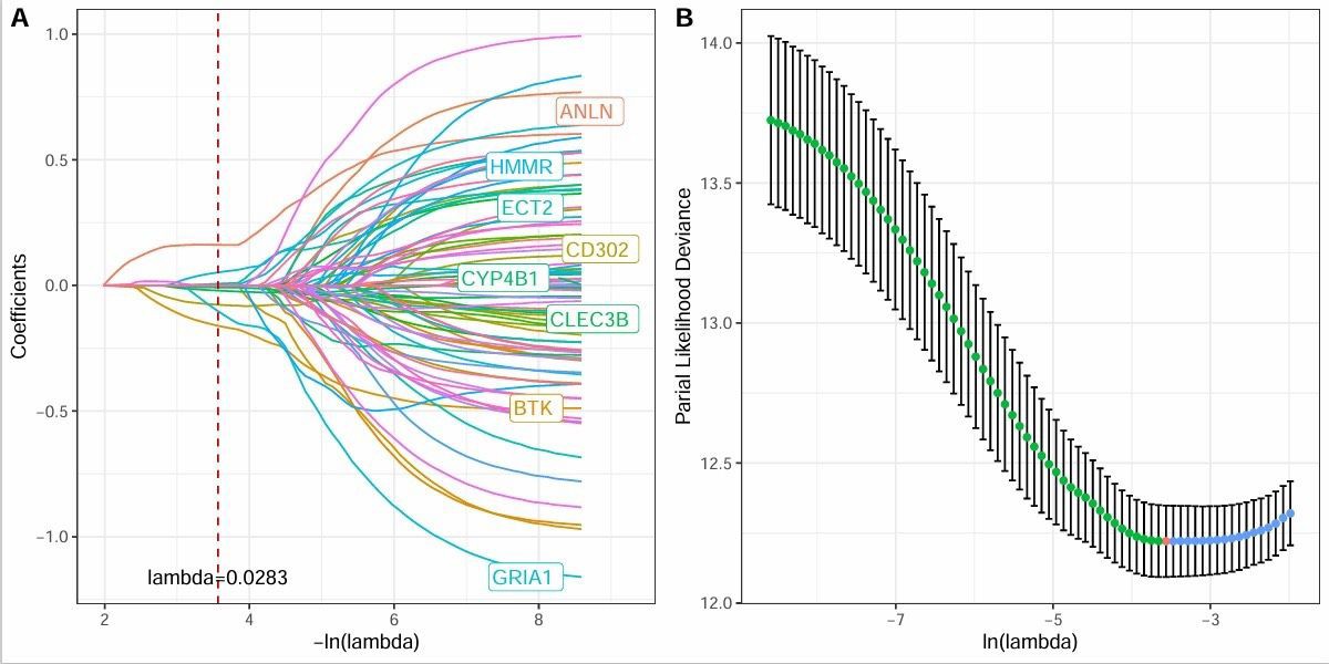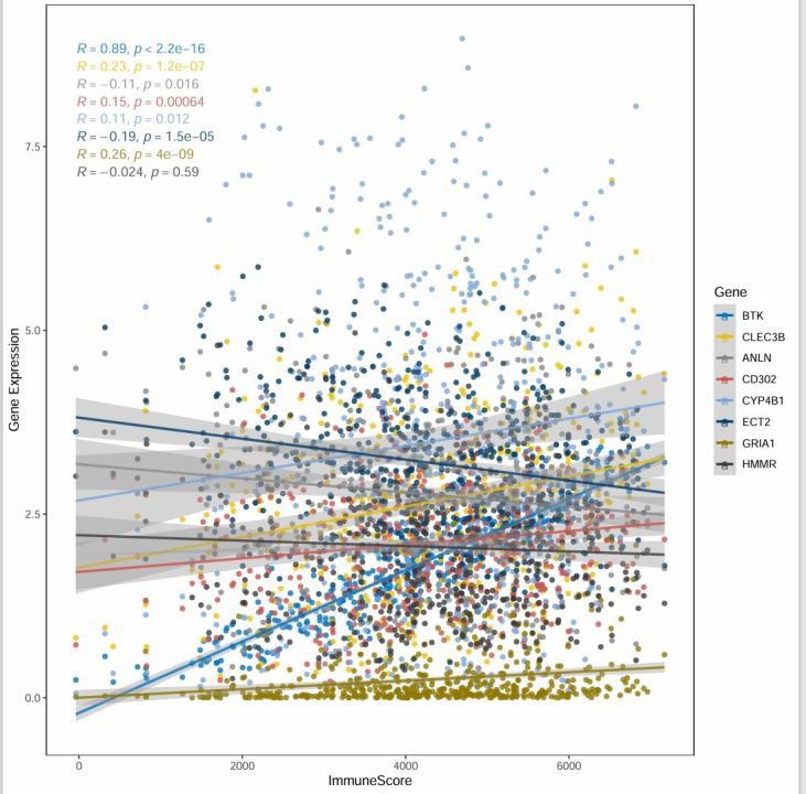 构建风险模型就像组装乐高,单因素Cox筛出的50个候选基因放进LASSO回归压缩后,剩下7个硬核玩家。有意思的是用stepAIC做变量选择时,某个基因每次都被踢出模型------这货可能是个专业气氛组。最终的列线图要玩点视觉魔术,把年龄、分期和风险评分画成动态可调的滑块,临床医生看到直接眼睛发亮。