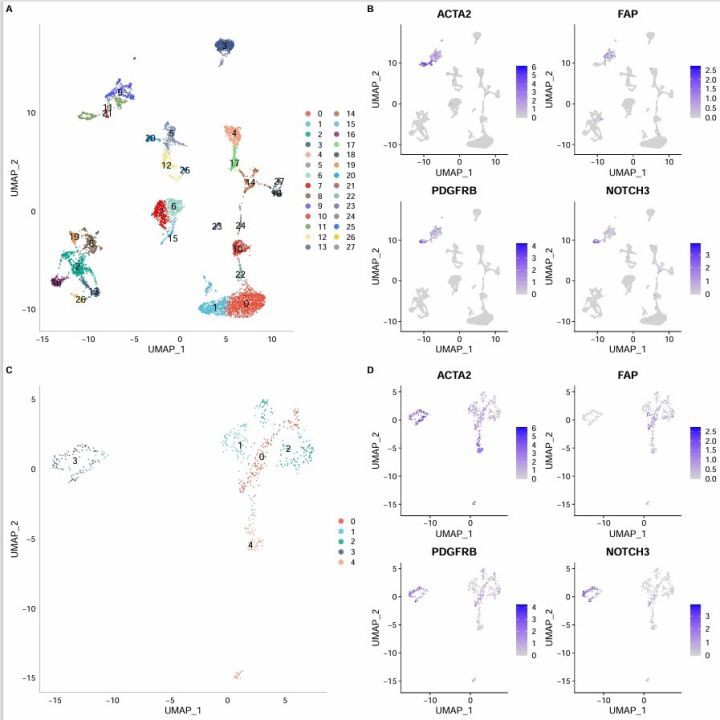 这个预处理就像筛沙子,筛掉质量差的细胞后,数据标准化得用SCTransform才够劲。注意这里设置的vars.to.regress参数,线粒体基因的影响必须被中和掉。当UMAP图上的细胞聚成20多个小岛时,用经典标记基因PDGFRA、ACTA2给成纤维细胞挂牌子特别重要------千万别把周细胞错当成CAF,那会闹大笑话。