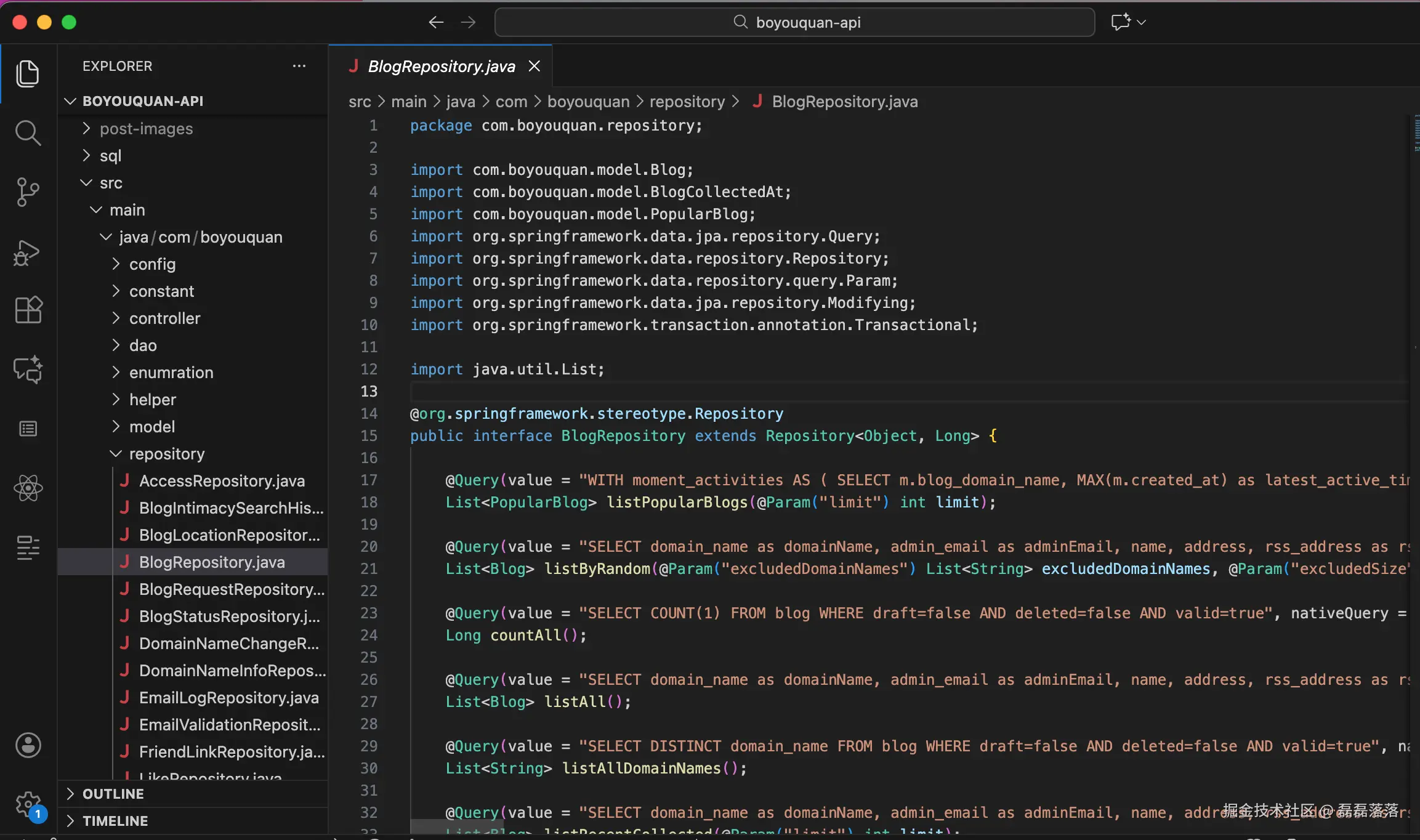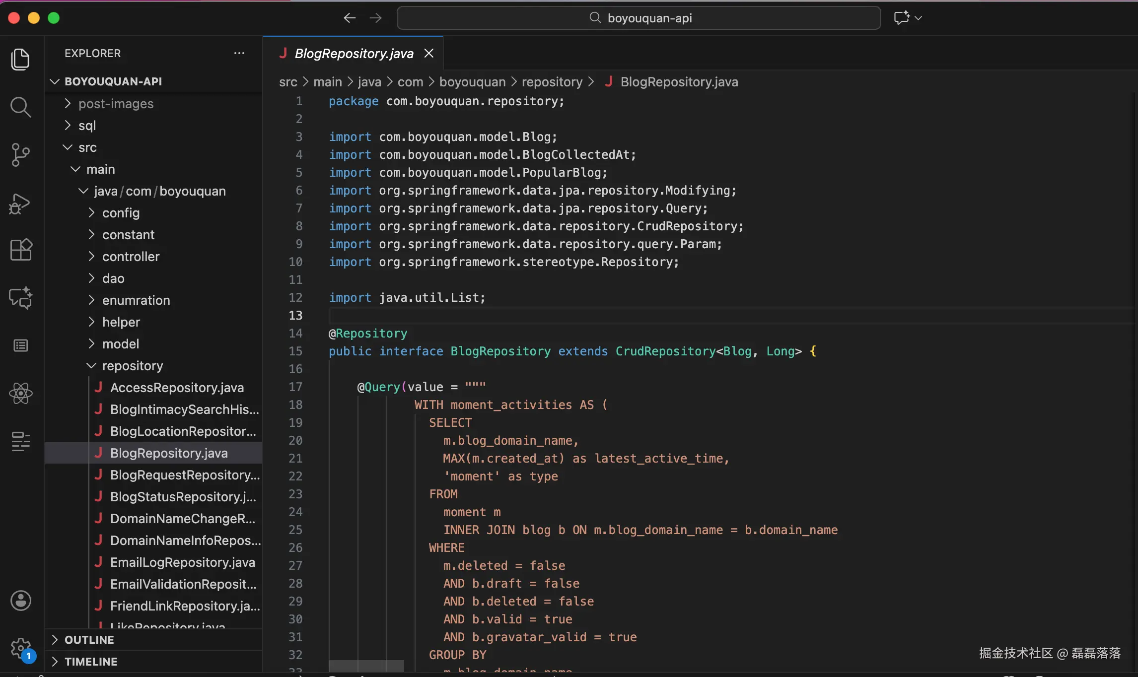 博友圈后端是一个使用 Maven 管理的 Spring Boot 项目,负责给前端提供 RESTful API。