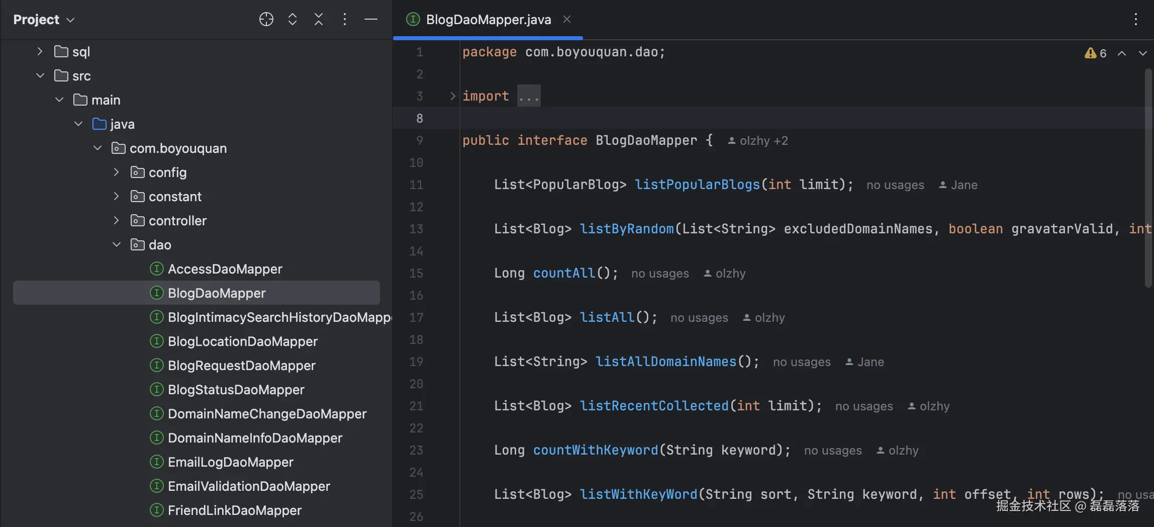 `com.boyouquan.dao` 包下原始的 `BlogDaoMapper` 接口定义如下:
