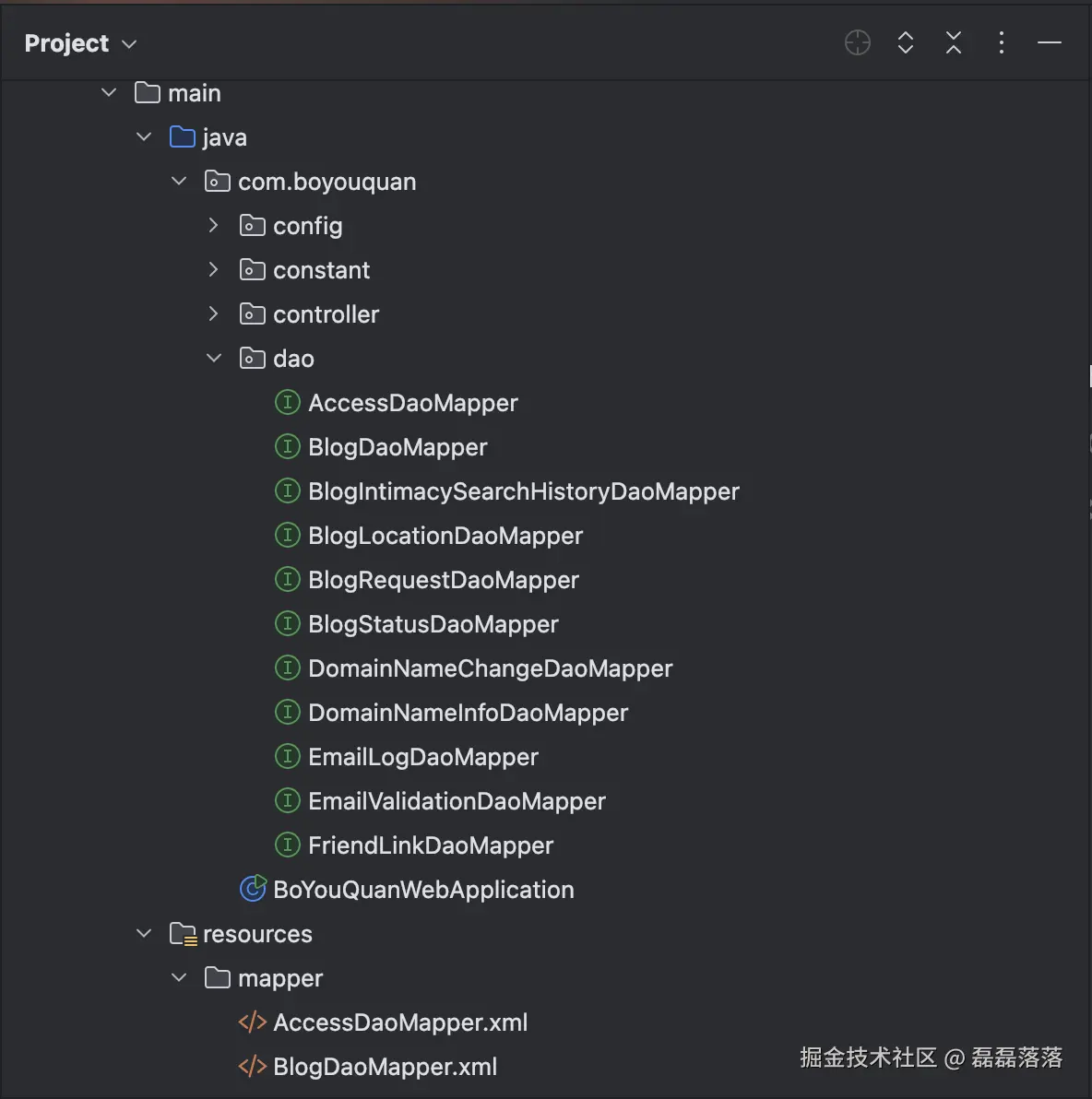 其数据库访问层目前是基于 MyBatis 实现的,源码目录 src/main/java 下的包 com.boyouquan.dao 下定义了一组 Mapper 接口;资源目录 src/main/resources 下的子目录 mapper 下存放与 Mapper 接口对应的 XML 文件。