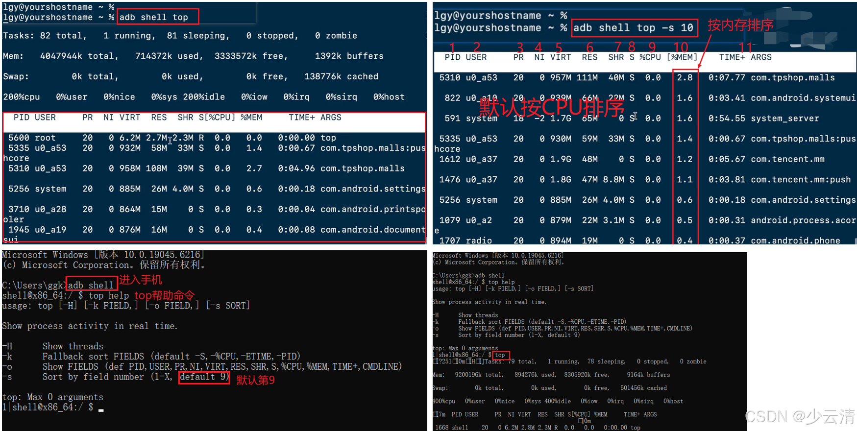 格式:adb shell top -s 列号