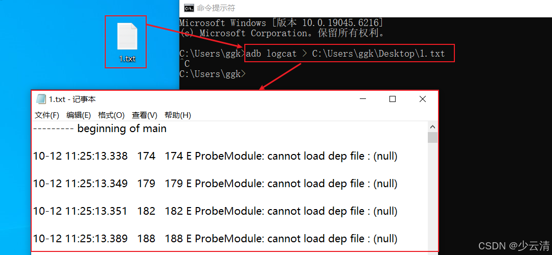 ① adb logcat >C:\Users\ggk\Desktop\1.txt