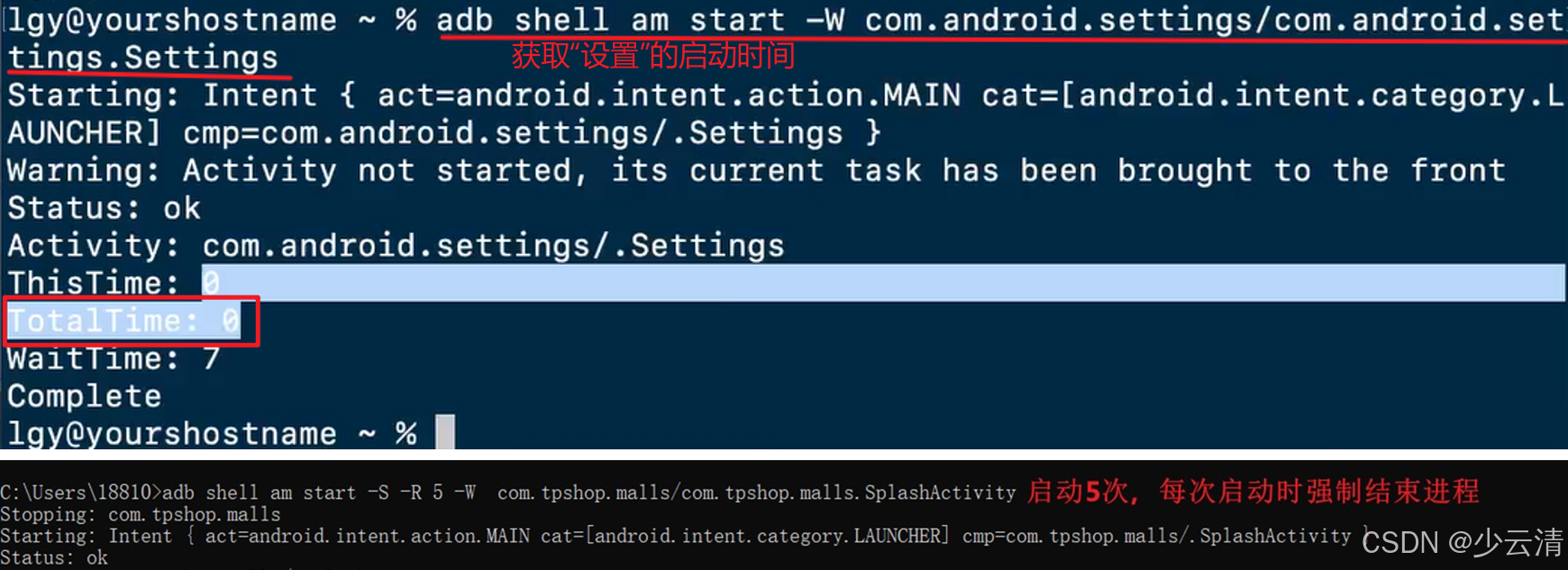 TotalTime:应用的启动时间,包括创建进程、App初始化、Activity初始化到界面显示。