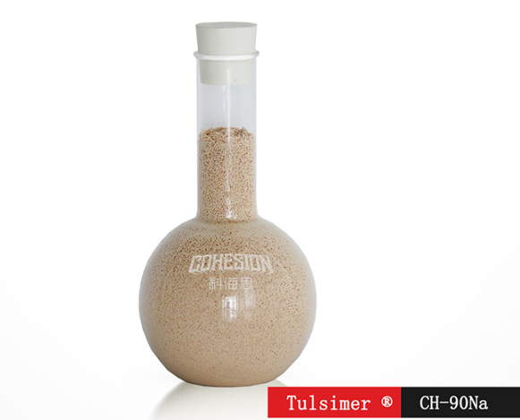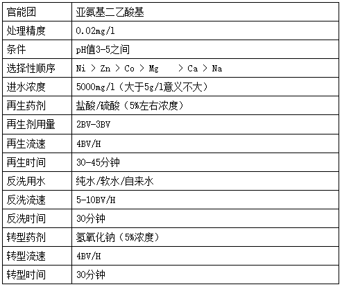 CH-90Na对除铜镍铅锌钴锰等具有特定的选择性,尤其在镍离子及络合态镍(柠檬酸、醋酸、苹果酸、酒石酸、琥珀酸、羟基乙酸等,以及锌镍合金、镍铵络合物等)的处理方面有强的结合作用和应用优势,适合在酸性环境(pH值3左右)下直接对镍吸附。对于强络合镍,需要先破络再除镍(如EDTA镍)。饱和吸附量大约在50g/l。
