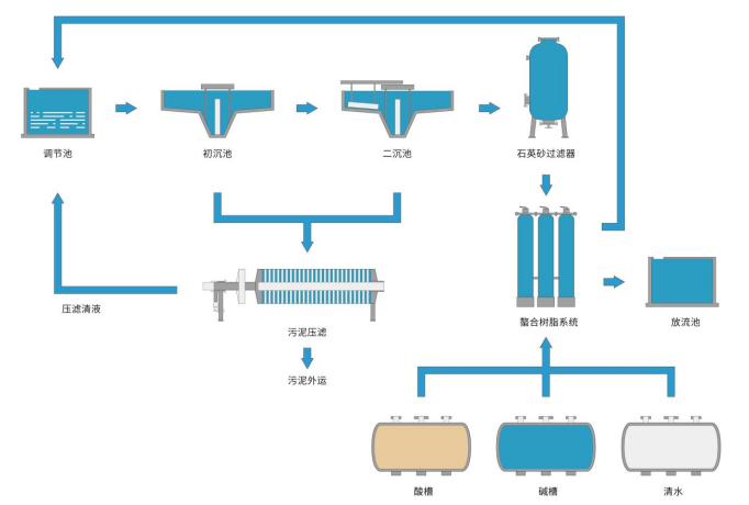 游离态重金属(如Ni²⁺、Cu²⁺):化学沉淀法(pH控制:镍9.5-10,铜8-9),深度处理选择离子交换法,