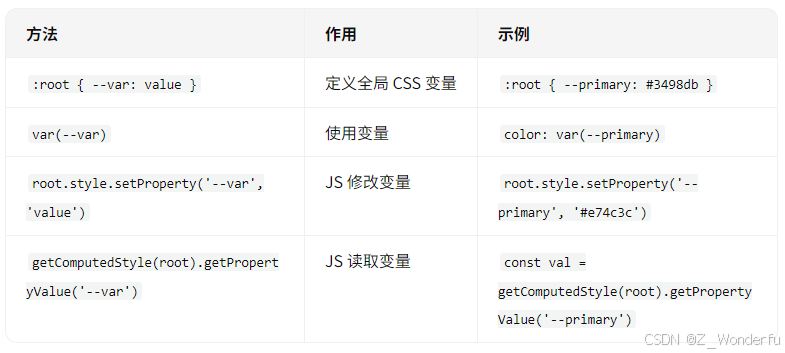 - 变量可以在 JS 中动态计算(如从 API 获取主题配置)。