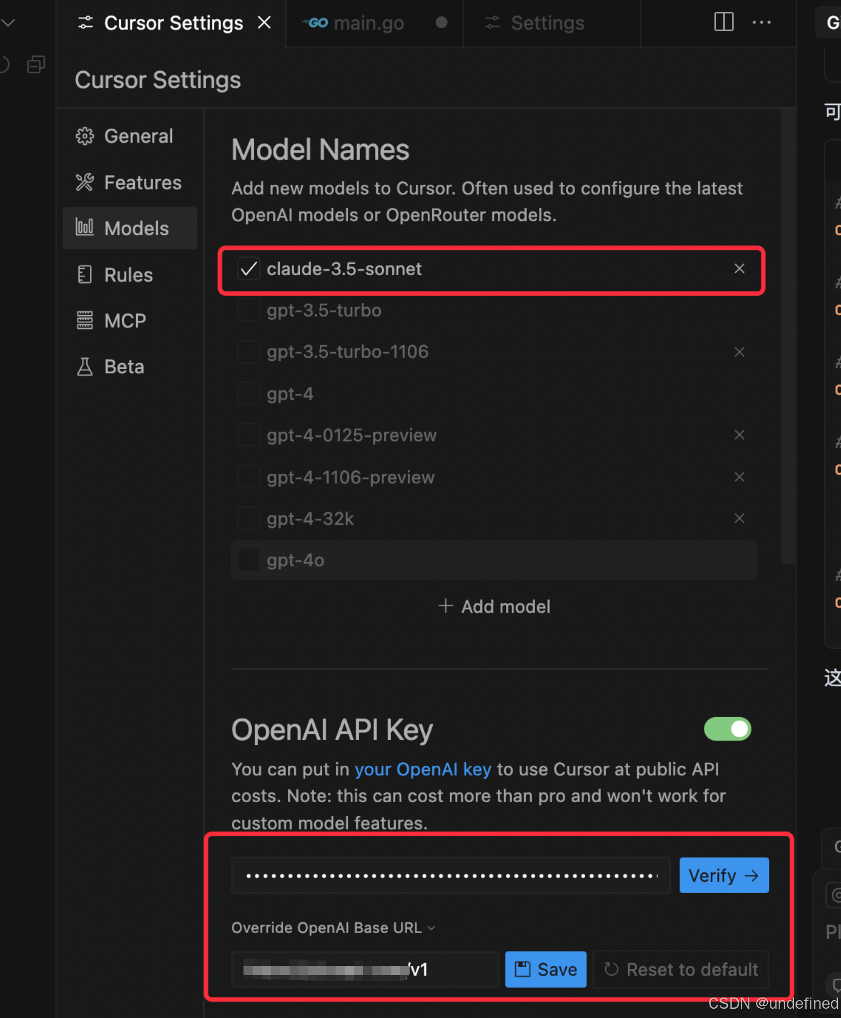 Cursor的API设置界面,用于填入Base URL和API Key。 - 配置Base URL和API Key:
