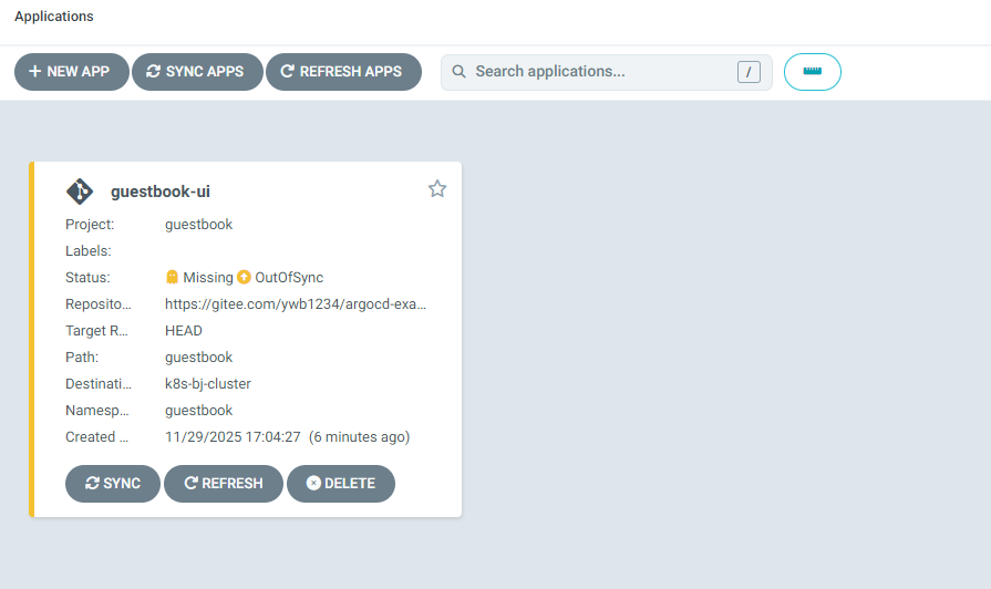 - 可视化管理:ArgoCD 原生提供可视化页面,可以清晰的看到所部署的应用,以及每个应用的状态、健康状况和同步状态等