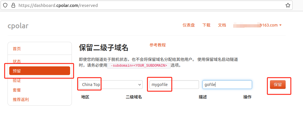 点击左侧的预留,选择保留二级子域名,地区选择china top,然后设置一个二级子域名名称,填写备注信息,点击保留。